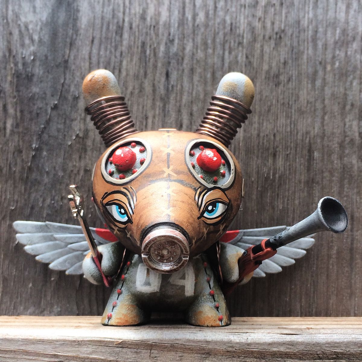 The toy is based on a rabbit figure with distinctive tubular ears. The origin of the name Dunny came from a combination of street slang and one of the early "Devil Bunny" prototypes. The Dunny is sold in four sizes - 3", 5", 8" and 20". The toy has three points of articulation; a 360 degree rotational head and two arms. An artist card or sticker is also included with the 3" Dunny from a series. Most 3" Dunnys and some 8" Dunnys are normally sold as "blind assortment"; the figure is packaged inside a sealed foil wrapper, such that the buyer is not able to see which figure and accessories they are buying. Sealing the figure prevents people from opening and peeking in the boxes and buying only the figures they want. Most Dunnys are packaged inside a clear plastic bag in addition to the foil wrapper. In the second-hand market, this assures the buyer that the article was never on display and is in a "new" condition. With the success of vinyl toys as a medium for expression, many fans and artists have put their own design onto blank Dunnys. Donald Ross also known as “scribe” is 37 years old and currently lives in Kansas City, Missouri of the United States. The animated, public murals by Scribe are readily recognizable in Midtown Kansas City and throughout different part of the United States, Canada and down into Mexico where he has both painted murals and had gallery shows. Scribe incorporates a menagerie of animal characters developed over many years representing a particular, self-referential trait that he inserts in various scenarios. Scribe intersperses personal iconography, biblical and fairytale references, animation and metaphor in works intended as contemporary parables for public audiences, hence the use of his artist name and persona. Through accessible idiom and image, Scribe incorporates humor and play in the conveyance of serious messages regarding personal integrity, attainment of knowledge, and adventure. In the past five years scribe has been focused on a diverse career in art. He is currently the Art Director at Children’s Mercy Hospital in Kansas City where he does everything from graphic design, painting murals throughout four locations around the metro and managing large scale design and installation of a Terrazzo Flooring project.His most recent project was airbrushing the hospital owned Lifeflight Helicopter.Outside of his duties