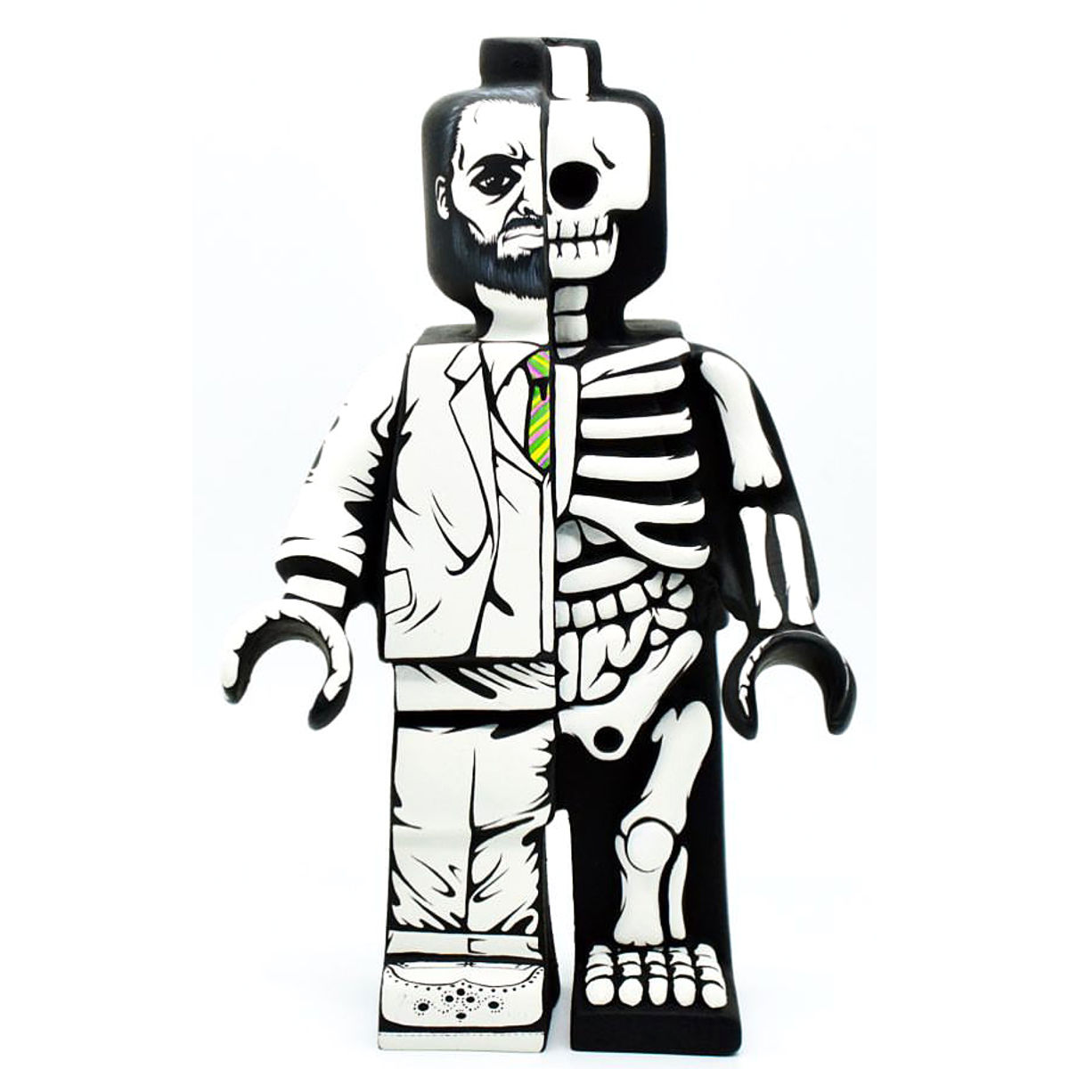 A LEGO-like figure that is split down the middle. The left side of the figure appears to be a human character with a beard, wearing a suit and a necktie. The right side of the figure is a skeleton, showing the internal structure of bones. The figure stands upright with both arms extended outward.Born into the greyness of England at the end of the Seventies, by the age of four Jon-Paul Kaiser knew that what he wanted to do in life was a draw. From that point he rarely strayed from that path; scribbling and doodling his way through School, College and University. After working with Porlzilla, Jon-Paul decided to go it alone concentrating at first on the toy customization scene, building up a name and strong reputation for himself with his stark Black & White custom style, influenced by comic book art, film noir & Ukiyo-e prints. This lead to him being approached by established toy producers for designs for their platform toys. Principally amongst these are Toy2R who have released numerous JPK Platforms.