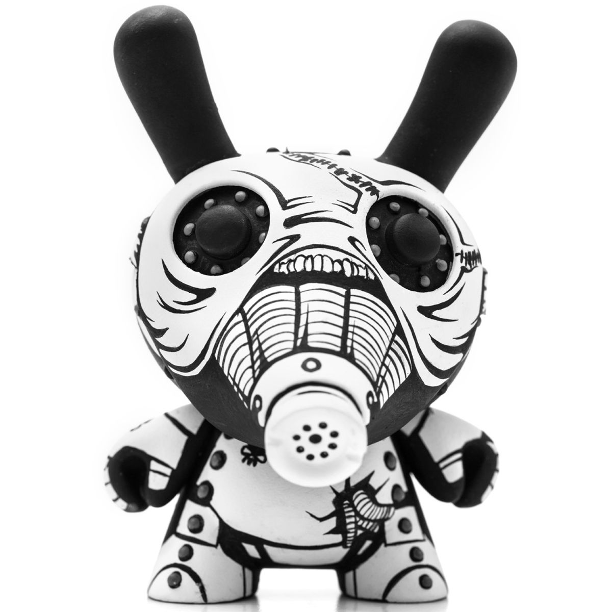 A toy figure that appears to be a stylized rabbit. The toy has a distinct design with large, round eyes and prominent ears. The facial features are intricately detailed with patterns and lines, giving it a unique and artistic appearance. The toy is predominantly white with black detailing, and it has a circular nose. The overall design is reminiscent of a sugar skull, commonly associated with Day of the Dead (Día de los Muertos) celebrations.Born into the greyness of England at the end of the Seventies, by the age of four Jon-Paul Kaiser knew that what he wanted to do in life was a draw. From that point he rarely strayed from that path; scribbling and doodling his way through School, College and University. After working with Porlzilla, Jon-Paul decided to go it alone concentrating at first on the toy customization scene, building up a name and strong reputation for himself with his stark Black & White custom style, influenced by comic book art, film noir & Ukiyo-e prints. This lead to him being approached by established toy producers for designs for their platform toys. Principally amongst these are Toy2R who have released numerous JPK Platforms. The toy is based on a rabbit figure with distinctive tubular ears. The origin of the name Dunny came from a combination of street slang and one of the early "Devil Bunny" prototypes. The Dunny is sold in four sizes - 3", 5", 8" and 20". The toy has three points of articulation; a 360 degree rotational head and two arms. An artist card or sticker is also included with the 3" Dunny from a series. Most 3" Dunnys and some 8" Dunnys are normally sold as "blind assortment"; the figure is packaged inside a sealed foil wrapper, such that the buyer is not able to see which figure and accessories they are buying. Sealing the figure prevents people from opening and peeking in the boxes and buying only the figures they want. Most Dunnys are packaged inside a clear plastic bag in addition to the foil wrapper. In the second-hand market, this assures the buyer that the article was never on display and is in a "new" condition. With the success of vinyl toys as a medium for expression, many fans and artists have put their own design onto blank Dunnys.