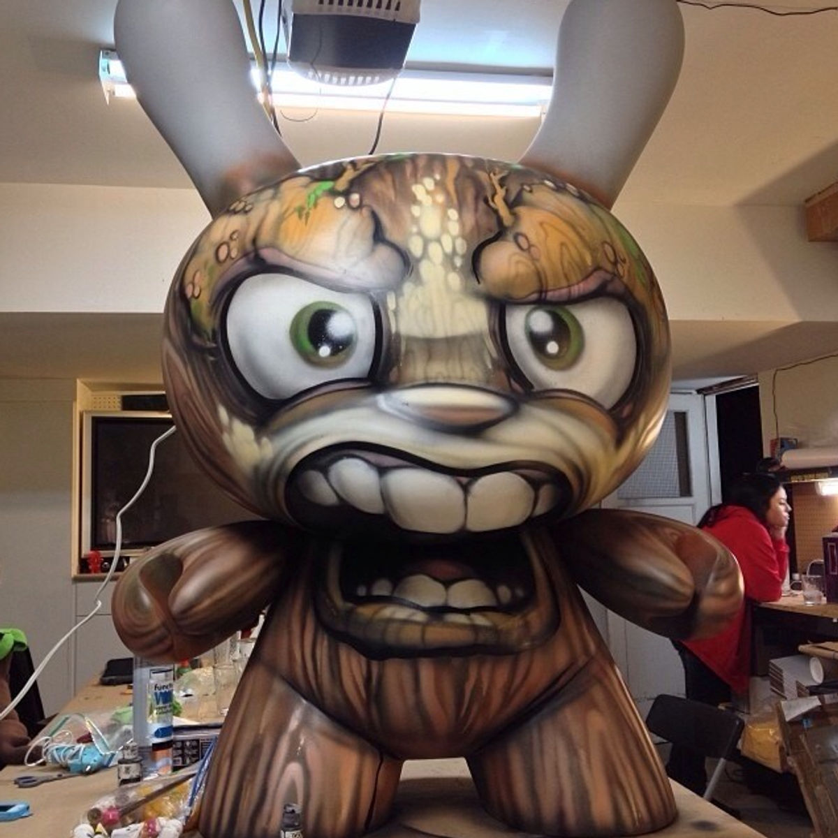 The toy is based on a rabbit figure with distinctive tubular ears. The origin of the name Dunny came from a combination of street slang and one of the early "Devil Bunny" prototypes. The Dunny is sold in four sizes - 3", 5", 8" and 20". The toy has three points of articulation; a 360 degree rotational head and two arms. An artist card or sticker is also included with the 3" Dunny from a series. Most 3" Dunnys and some 8" Dunnys are normally sold as "blind assortment"; the figure is packaged inside a sealed foil wrapper, such that the buyer is not able to see which figure and accessories they are buying. Sealing the figure prevents people from opening and peeking in the boxes and buying only the figures they want. Most Dunnys are packaged inside a clear plastic bag in addition to the foil wrapper. In the second-hand market, this assures the buyer that the article was never on display and is in a "new" condition. With the success of vinyl toys as a medium for expression, many fans and artists have put their own design onto blank Dunnys. Donald Ross also known as “scribe” is 37 years old and currently lives in Kansas City, Missouri of the United States. The animated, public murals by Scribe are readily recognizable in Midtown Kansas City and throughout different part of the United States, Canada and down into Mexico where he has both painted murals and had gallery shows. Scribe incorporates a menagerie of animal characters developed over many years representing a particular, self-referential trait that he inserts in various scenarios. Scribe intersperses personal iconography, biblical and fairytale references, animation and metaphor in works intended as contemporary parables for public audiences, hence the use of his artist name and persona. Through accessible idiom and image, Scribe incorporates humor and play in the conveyance of serious messages regarding personal integrity, attainment of knowledge, and adventure. In the past five years scribe has been focused on a diverse career in art. He is currently the Art Director at Children’s Mercy Hospital in Kansas City where he does everything from graphic design, painting murals throughout four locations around the metro and managing large scale design and installation of a Terrazzo Flooring project.His most recent project was airbrushing the hospital owned Lifeflight Helicopter.Outside of his duties