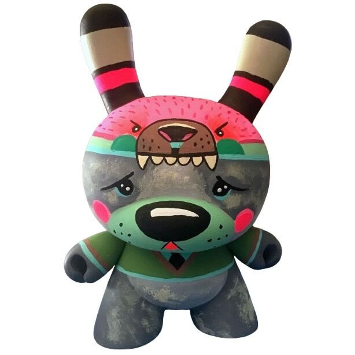 The toy is based on a rabbit figure with distinctive tubular ears. The origin of the name Dunny came from a combination of street slang and one of the early "Devil Bunny" prototypes. The Dunny is sold in four sizes - 3", 5", 8" and 20". The toy has three points of articulation; a 360 degree rotational head and two arms. An artist card or sticker is also included with the 3" Dunny from a series. Most 3" Dunnys and some 8" Dunnys are normally sold as "blind assortment"; the figure is packaged inside a sealed foil wrapper, such that the buyer is not able to see which figure and accessories they are buying. Sealing the figure prevents people from opening and peeking in the boxes and buying only the figures they want. Most Dunnys are packaged inside a clear plastic bag in addition to the foil wrapper. In the second-hand market, this assures the buyer that the article was never on display and is in a "new" condition. With the success of vinyl toys as a medium for expression, many fans and artists have put their own design onto blank Dunnys.