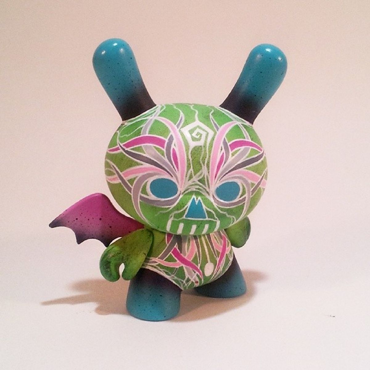 Boo! The toy is based on a rabbit figure with distinctive tubular ears. The origin of the name Dunny came from a combination of street slang and one of the early "Devil Bunny" prototypes. The Dunny is sold in four sizes - 3", 5", 8" and 20". The toy has three points of articulation; a 360 degree rotational head and two arms. An artist card or sticker is also included with the 3" Dunny from a series. Most 3" Dunnys and some 8" Dunnys are normally sold as "blind assortment"; the figure is packaged inside a sealed foil wrapper, such that the buyer is not able to see which figure and accessories they are buying. Sealing the figure prevents people from opening and peeking in the boxes and buying only the figures they want. Most Dunnys are packaged inside a clear plastic bag in addition to the foil wrapper. In the second-hand market, this assures the buyer that the article was never on display and is in a "new" condition. With the success of vinyl toys as a medium for expression, many fans and artists have put their own design onto blank Dunnys.