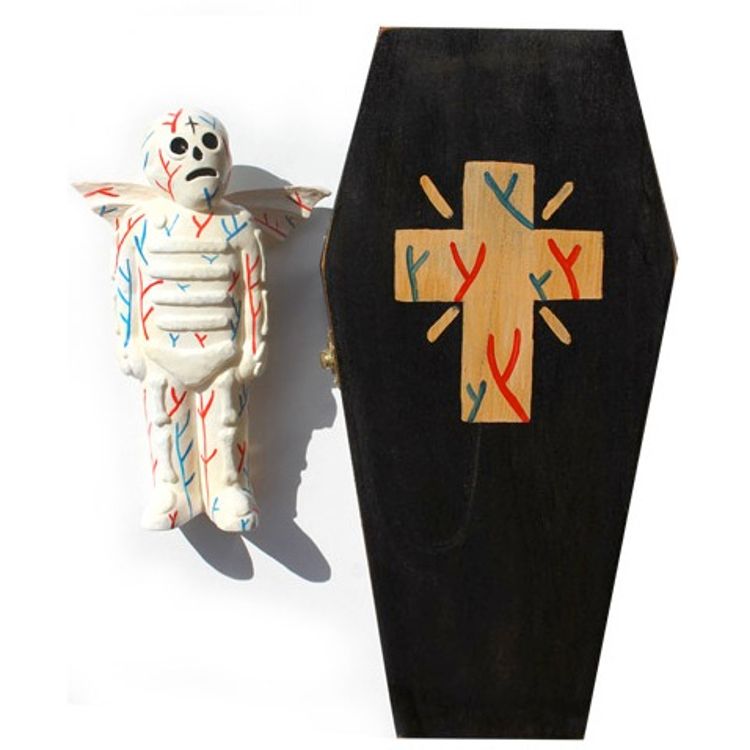 Self-produced art toys are designer collectibles created and manufactured independently by the artist or small teams without the backing of a large toy company or mass-market brand. These toys are often highly personal, artistic expressions and are usually made in limited runs. Key Characteristics include independent creation where the artist is in control of the entire process from concept, sculpting, and painting to production and packaging. These are usually made in small batches, often 10–100 pieces, which adds to their rarity, made using materials like resin, sofubi (Japanese soft vinyl), or 3D-printed components. I am a Pittsburgh based artist who has spent time working as an embalmer in funeral homes. My paintings are made using acrylic paint, shellac, wood and nails and tell stories about death, devils and saints. I'm greatly influenced by The Day of the Dead, Halloween, horror films, churches, The German Expressionists and my time in funeral homes. Bones stands at approximately 8 inches tall and made of Japanese colored soft vinyl (sofubi). Manufacturing by Luke Rook/Grody Shogun. DKE Toys is a renowned American company specializing in designer toys, collectibles, and limited-edition art pieces. Founded in 2002, DKE Toys has become a key player in the designer toy scene, known for its unique collaborations with artists, custom toys, and pop culture-inspired releases. The company has developed a reputation for creating high-quality, highly collectible figures that often blend urban art, pop culture references, and nostalgic themes. DKE Toys works with a diverse roster of artists and designers to create limited-run figures that often reflect a blend of pop culture, street art, and fine art. Artists involved in DKE releases include well-known names in the designer toy world, such as Frank Kozik, Eric So, Luke Chueh, and many others.