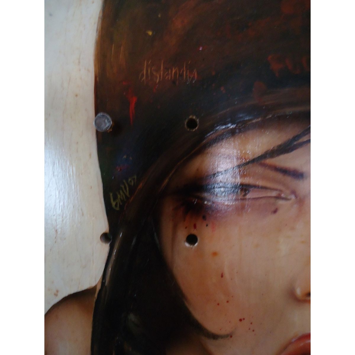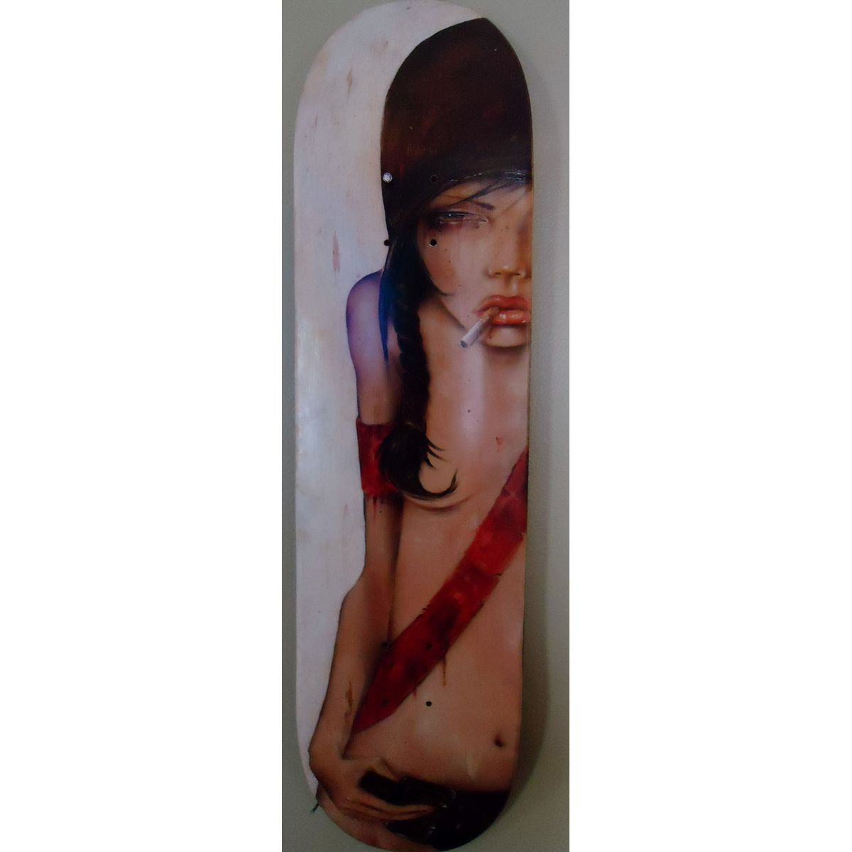 Oil paint is a type of slow-drying paint that consists of particles of pigment suspended in a drying oil, commonly linseed oil. The viscosity of the paint may be modified by the addition of a solvent such as turpentine or white spirit, and varnish may be added to increase the glossiness of the dried film. Oil paints have been used in Europe since the 12th century for simple decoration, but were not widely adopted as an artistic medium until the early 15th century. Common modern applications of oil paint are in finishing and protection of wood in buildings and exposed metal structures such as ships and bridges. Its hard-wearing properties and luminous colors make it desirable for both interior and exterior use on wood and metal. Due to its slow-drying properties, it has recently been used in paint-on-glass animation. Thickness of coat has considerable bearing on time required for drying: thin coats of oil paint dry relatively quickly. Celebrated fetish artist Brian M. Viveros is internationally embraced for his erotic paintings of doe-eyed beauties with Marlboros dangling seductively from their lips and has also recently been utilizing the medium of film to capture the dark and evocative debris that radiates from his mind. His paintings are a drunken mix of oil, airbrush, acrylic, and ink. In his work Viveros shines a light on his own inner world and society at large and aims to captivate even the most jaded eyes.
