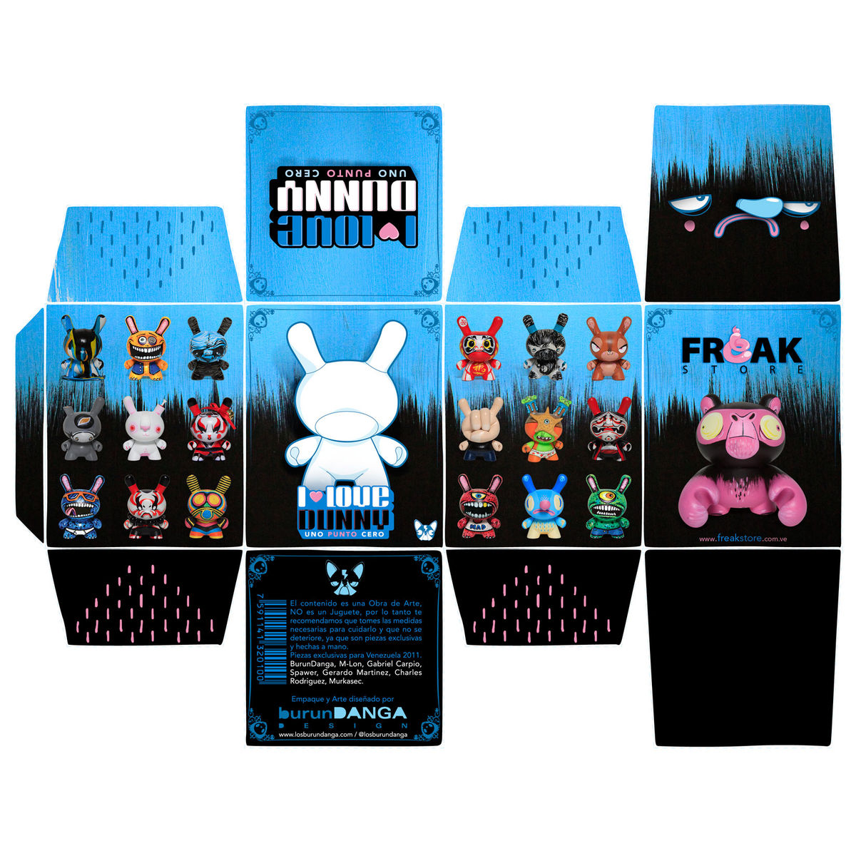 Burundangadesign@gmail.com The toy is based on a rabbit figure with distinctive tubular ears. The origin of the name Dunny came from a combination of street slang and one of the early "Devil Bunny" prototypes. The Dunny is sold in four sizes - 3", 5", 8" and 20". The toy has three points of articulation; a 360 degree rotational head and two arms. An artist card or sticker is also included with the 3" Dunny from a series. Most 3" Dunnys and some 8" Dunnys are normally sold as "blind assortment"; the figure is packaged inside a sealed foil wrapper, such that the buyer is not able to see which figure and accessories they are buying. Sealing the figure prevents people from opening and peeking in the boxes and buying only the figures they want. Most Dunnys are packaged inside a clear plastic bag in addition to the foil wrapper. In the second-hand market, this assures the buyer that the article was never on display and is in a "new" condition. With the success of vinyl toys as a medium for expression, many fans and artists have put their own design onto blank Dunnys.