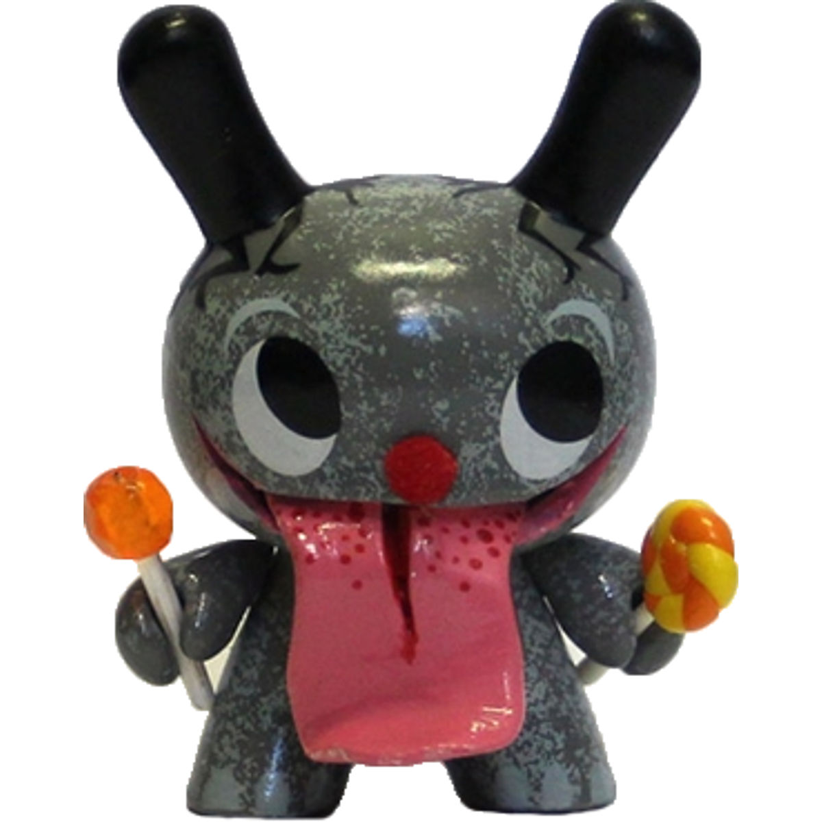 The toy is based on a rabbit figure with distinctive tubular ears. The origin of the name Dunny came from a combination of street slang and one of the early "Devil Bunny" prototypes. The Dunny is sold in four sizes - 3", 5", 8" and 20". The toy has three points of articulation; a 360 degree rotational head and two arms. An artist card or sticker is also included with the 3" Dunny from a series. Most 3" Dunnys and some 8" Dunnys are normally sold as "blind assortment"; the figure is packaged inside a sealed foil wrapper, such that the buyer is not able to see which figure and accessories they are buying. Sealing the figure prevents people from opening and peeking in the boxes and buying only the figures they want. Most Dunnys are packaged inside a clear plastic bag in addition to the foil wrapper. In the second-hand market, this assures the buyer that the article was never on display and is in a "new" condition. With the success of vinyl toys as a medium for expression, many fans and artists have put their own design onto blank Dunnys. This is a limited edition of 100 custom Candy Licker Dunnys to Match a Song I did With Wu Tang Clans Method man .. Dunnys come with a CD With 2 Tracks feat. Shawn Wigs & Method Man . . They Are basically all Different no one is the same But Also they are Basically the same ...