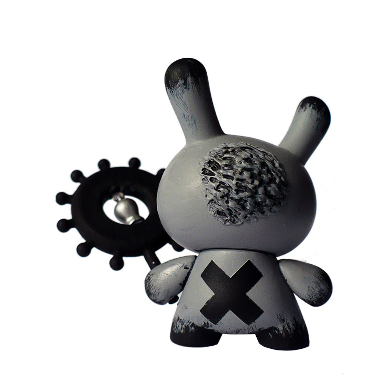 The toy is based on a rabbit figure with distinctive tubular ears. The origin of the name Dunny came from a combination of street slang and one of the early "Devil Bunny" prototypes. The Dunny is sold in four sizes - 3", 5", 8" and 20". The toy has three points of articulation; a 360 degree rotational head and two arms. An artist card or sticker is also included with the 3" Dunny from a series. Most 3" Dunnys and some 8" Dunnys are normally sold as "blind assortment"; the figure is packaged inside a sealed foil wrapper, such that the buyer is not able to see which figure and accessories they are buying. Sealing the figure prevents people from opening and peeking in the boxes and buying only the figures they want. Most Dunnys are packaged inside a clear plastic bag in addition to the foil wrapper. In the second-hand market, this assures the buyer that the article was never on display and is in a "new" condition. With the success of vinyl toys as a medium for expression, many fans and artists have put their own design onto blank Dunnys.