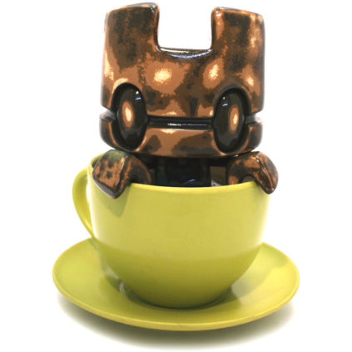 Lunartik in a Cup of Tea is a designer toy series created by British artist Matt JOnes (aka Lunartik). These collectible vinyl figures feature a stylized character sitting inside a teacup, blending a whimsical and minimalist design with a playful tea-themed concept. The original Lunartik in a Cup of Tea figure is a small, round-headed character with a simple face, often depicted with a tea bag tag hanging from the cup. The series includes Mini-Teas (smaller versions with various colors and flavors) and special edition teas, featuring collaborations, custom designs, and exclusive releases. The custom tea tour was a touring show with exhibitions at Forbidden Planet London, Outland Gallery Amsterdam, sixxa store Vienna, Fat Buddah Glasgow, Richard Goodall Gallery Manchester, Iksentrik Bath and the final exhibition/auction at Kidrobot London! CROM is a London based artist who specializes in books, games, tattooing and necromancy, among other things. Creator of graphic novels Raiders and Birdking , Wizards Of the Coast artist, CROM is lastingly obsessed with manga, games, comics and pop culture, which continue to shape his work and style.