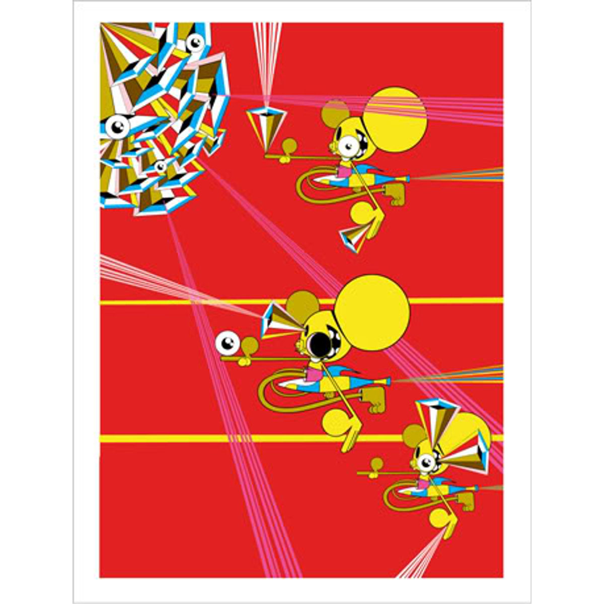 Giclée (pronounced "zhee-clay") is a neologism for the process of making fine art prints from a digital source using ink-jet printing. The word "giclée" is derived from the French language word "le gicleur" meaning "nozzle", or more specifically "gicler" meaning "to squirt, spurt, or spray". It was coined in 1991 by Jack Duganne, a printmaker working in the field, to represent any inkjet-based digital print used as fine art. The intent of that name was to distinguish commonly known industrial "Iris proofs" from the type of fine art prints artists were producing on those same types of printers. The name was originally applied to fine art prints created on Iris printers in a process invented in the early 1990s but has since come to mean any high quality ink-jet print and is often used in galleries and print shops to denote such prints. Marshall was born in 1968 in New London, Connecticut and is currently based in North Carolina. He was raised in a military family who moved frequently along the East Coast throughout his childhood and later lived in Hawaii and Japan. In his youth, Marshall turned to punk rock, skateboarding and graffiti subcultures for inclusion and identity. His Space Monkey character was born out of graffiti, which he discovered in 1994 in the rail yards of California and later in Chicago. After an education in anthropology and sociology, followed by receiving a BFA from the Art Institute of Chicago in 1995, Marshall worked under the name Dalek to merge street art with influences from animation, Japanese pop, and the energy of the urban punk scene. In 2001, he reached a major turning point in his studio practice while working as an assistant/apprentice to the world-renowned artist Takashi Murakami. Marshall’s work has been shown in galleries and museums across North America, Europe and Japan.