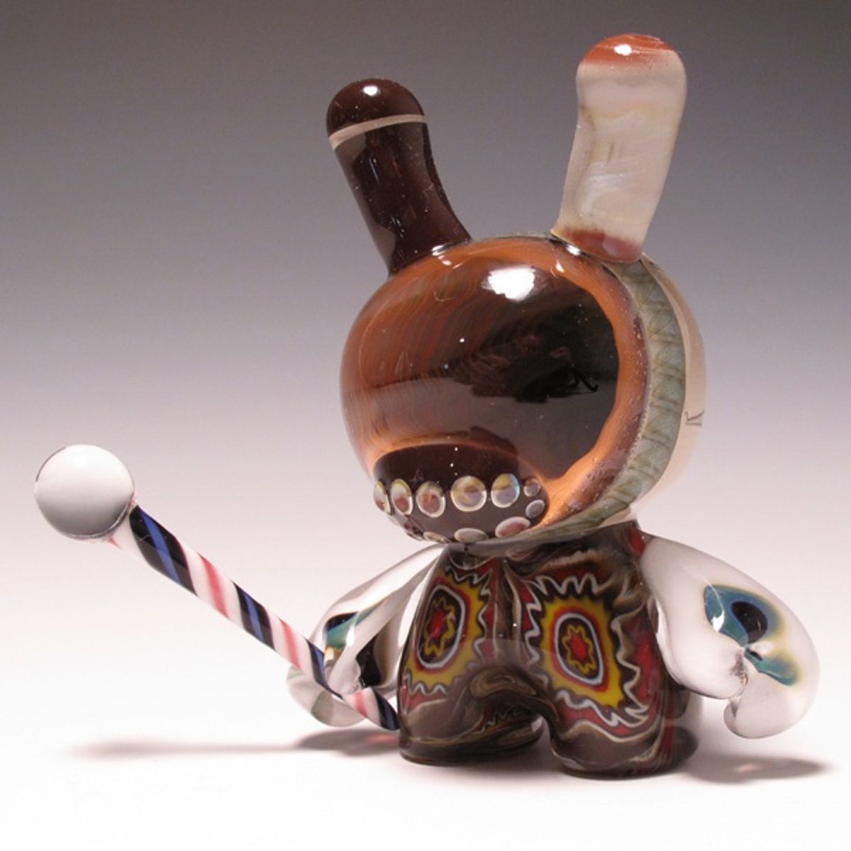 The toy is based on a rabbit figure with distinctive tubular ears. The origin of the name Dunny came from a combination of street slang and one of the early "Devil Bunny" prototypes. The Dunny is sold in four sizes - 3", 5", 8" and 20". The toy has three points of articulation; a 360 degree rotational head and two arms. An artist card or sticker is also included with the 3" Dunny from a series. Most 3" Dunnys and some 8" Dunnys are normally sold as "blind assortment"; the figure is packaged inside a sealed foil wrapper, such that the buyer is not able to see which figure and accessories they are buying. Sealing the figure prevents people from opening and peeking in the boxes and buying only the figures they want. Most Dunnys are packaged inside a clear plastic bag in addition to the foil wrapper. In the second-hand market, this assures the buyer that the article was never on display and is in a "new" condition. With the success of vinyl toys as a medium for expression, many fans and artists have put their own design onto blank Dunnys. Devin Somerville was born in Green Bay, Wisconsin in February of 1976. He moved to Milwaukee in 1994 and attended UWM to study art and architecture. After discovering the specialized process of borosilicate lampworking, he moved to Oregon in 1998 to concentrate on this art form. In January of 2001 he started a shop in Northern California. A year later he decided to bring his unique talent home to create fine hand blown glass for the people of Milwaukee. As co-owner of Ring of Fire Glassworks, Devin established a business which included a studio and retail gallery with Paul Stephan in January of 2002. In May of 2003, Ring of Fire moved to Walker's Point, just south of downtown Milwaukee. This expanded workspace included a cold work room, 8 lampworking stations, and a gallery. Ring of Fire closed its doors in December of 2005 and both artists reverted to small home studios. Now in a more private and serene atmosphere, Devin is pursuing lampworking with full force in his many forms of functional and decorative creations. Devin is currently showing fine glassware in galleries throughout the world, web galleries, and auctions.