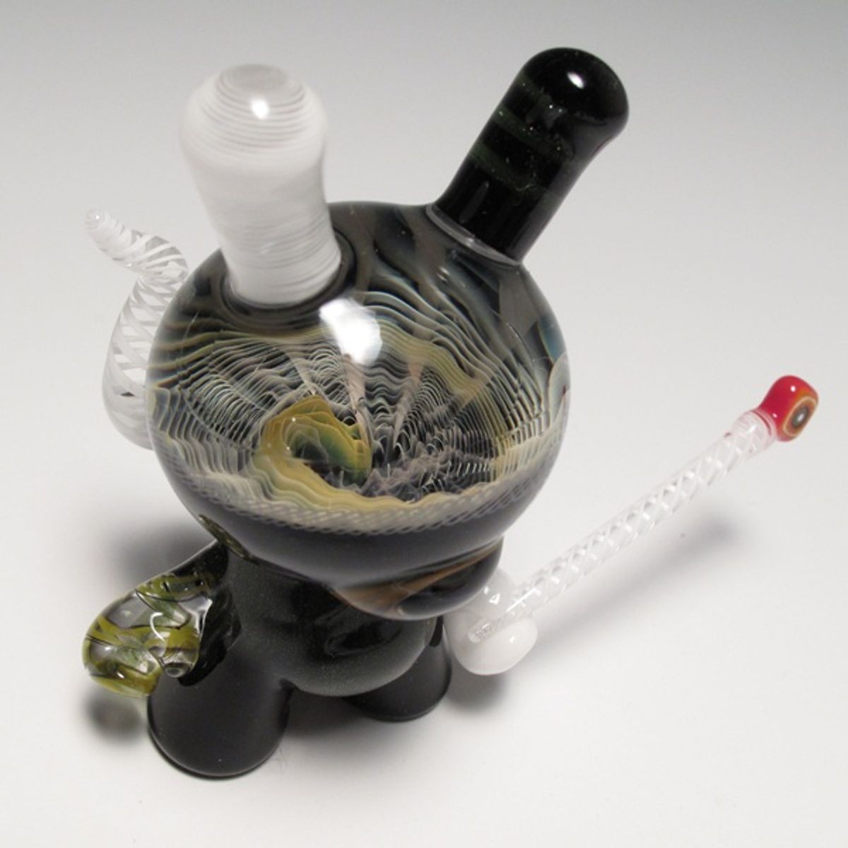 The toy is based on a rabbit figure with distinctive tubular ears. The origin of the name Dunny came from a combination of street slang and one of the early "Devil Bunny" prototypes. The Dunny is sold in four sizes - 3", 5", 8" and 20". The toy has three points of articulation; a 360 degree rotational head and two arms. An artist card or sticker is also included with the 3" Dunny from a series. Most 3" Dunnys and some 8" Dunnys are normally sold as "blind assortment"; the figure is packaged inside a sealed foil wrapper, such that the buyer is not able to see which figure and accessories they are buying. Sealing the figure prevents people from opening and peeking in the boxes and buying only the figures they want. Most Dunnys are packaged inside a clear plastic bag in addition to the foil wrapper. In the second-hand market, this assures the buyer that the article was never on display and is in a "new" condition. With the success of vinyl toys as a medium for expression, many fans and artists have put their own design onto blank Dunnys. Devin Somerville was born in Green Bay, Wisconsin in February of 1976. He moved to Milwaukee in 1994 and attended UWM to study art and architecture. After discovering the specialized process of borosilicate lampworking, he moved to Oregon in 1998 to concentrate on this art form. In January of 2001 he started a shop in Northern California. A year later he decided to bring his unique talent home to create fine hand blown glass for the people of Milwaukee. As co-owner of Ring of Fire Glassworks, Devin established a business which included a studio and retail gallery with Paul Stephan in January of 2002. In May of 2003, Ring of Fire moved to Walker's Point, just south of downtown Milwaukee. This expanded workspace included a cold work room, 8 lampworking stations, and a gallery. Ring of Fire closed its doors in December of 2005 and both artists reverted to small home studios. Now in a more private and serene atmosphere, Devin is pursuing lampworking with full force in his many forms of functional and decorative creations. Devin is currently showing fine glassware in galleries throughout the world, web galleries, and auctions.