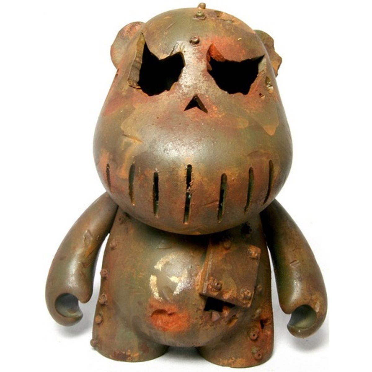 DrilOne is a New Yorker at heart and a San Franciscan by location. On the East Coast, he painted only 2d work; on the west coast, toys and other 3D objects are his preferred canvas. He began working with vinyl in 2005, and soon after stumbled upon the formula that would serve as his signature style. By taking a playful object and distressing it to, quite literally, its breaking point, Dril comments on oblivion, transience, and re-birth. Dril says simply: “I love rust, decay, history, ruins, military, skulls, vintage, and all this makes me who I am.” Art is in Dril’s blood. The son of a painter, he cannot imagine or remember life without drawing. He is a veteran of the New York City public school system and spent most of his life amidst the city’s chaos and creativity. His upbringing and admiration for contemporary, pop and graffiti artists are reflected in his work. The many inspirations that inform his art include abandoned amusement parks, insane asylums and old military bunkers. Dril has made a name for himself with his instantly recognizable visual expression, and his sought-after figures can be seen in art galleries and collections around the world. Standouts among