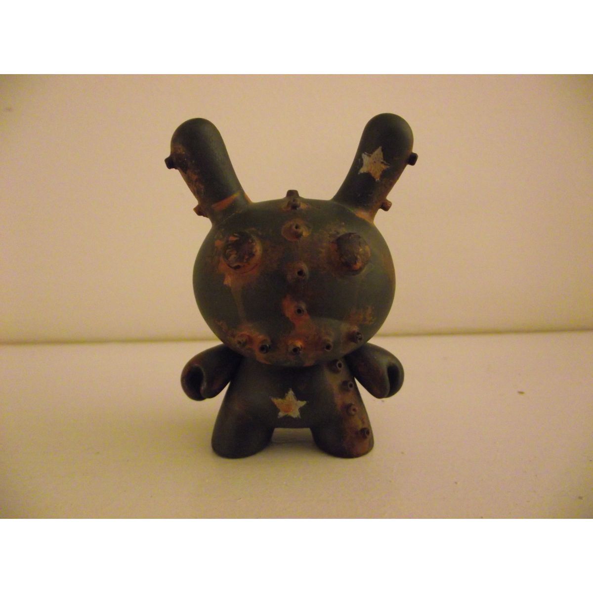 DrilOne is a New Yorker at heart and a San Franciscan by location. On the East Coast, he painted only 2d work; on the west coast, toys and other 3D objects are his preferred canvas. He began working with vinyl in 2005, and soon after stumbled upon the formula that would serve as his signature style. By taking a playful object and distressing it to, quite literally, its breaking point, Dril comments on oblivion, transience, and re-birth. Dril says simply: “I love rust, decay, history, ruins, military, skulls, vintage, and all this makes me who I am.” Art is in Dril’s blood. The son of a painter, he cannot imagine or remember life without drawing. He is a veteran of the New York City public school system and spent most of his life amidst the city’s chaos and creativity. His upbringing and admiration for contemporary, pop and graffiti artists are reflected in his work. The many inspirations that inform his art include abandoned amusement parks, insane asylums and old military bunkers. Dril has made a name for himself with his instantly recognizable visual expression, and his sought-after figures can be seen in art galleries and collections around the world. Standouts among The toy is based on a rabbit figure with distinctive tubular ears. The origin of the name Dunny came from a combination of street slang and one of the early "Devil Bunny" prototypes. The Dunny is sold in four sizes - 3", 5", 8" and 20". The toy has three points of articulation; a 360 degree rotational head and two arms. An artist card or sticker is also included with the 3" Dunny from a series. Most 3" Dunnys and some 8" Dunnys are normally sold as "blind assortment"; the figure is packaged inside a sealed foil wrapper, such that the buyer is not able to see which figure and accessories they are buying. Sealing the figure prevents people from opening and peeking in the boxes and buying only the figures they want. Most Dunnys are packaged inside a clear plastic bag in addition to the foil wrapper. In the second-hand market, this assures the buyer that the article was never on display and is in a "new" condition. With the success of vinyl toys as a medium for expression, many fans and artists have put their own design onto blank Dunnys.