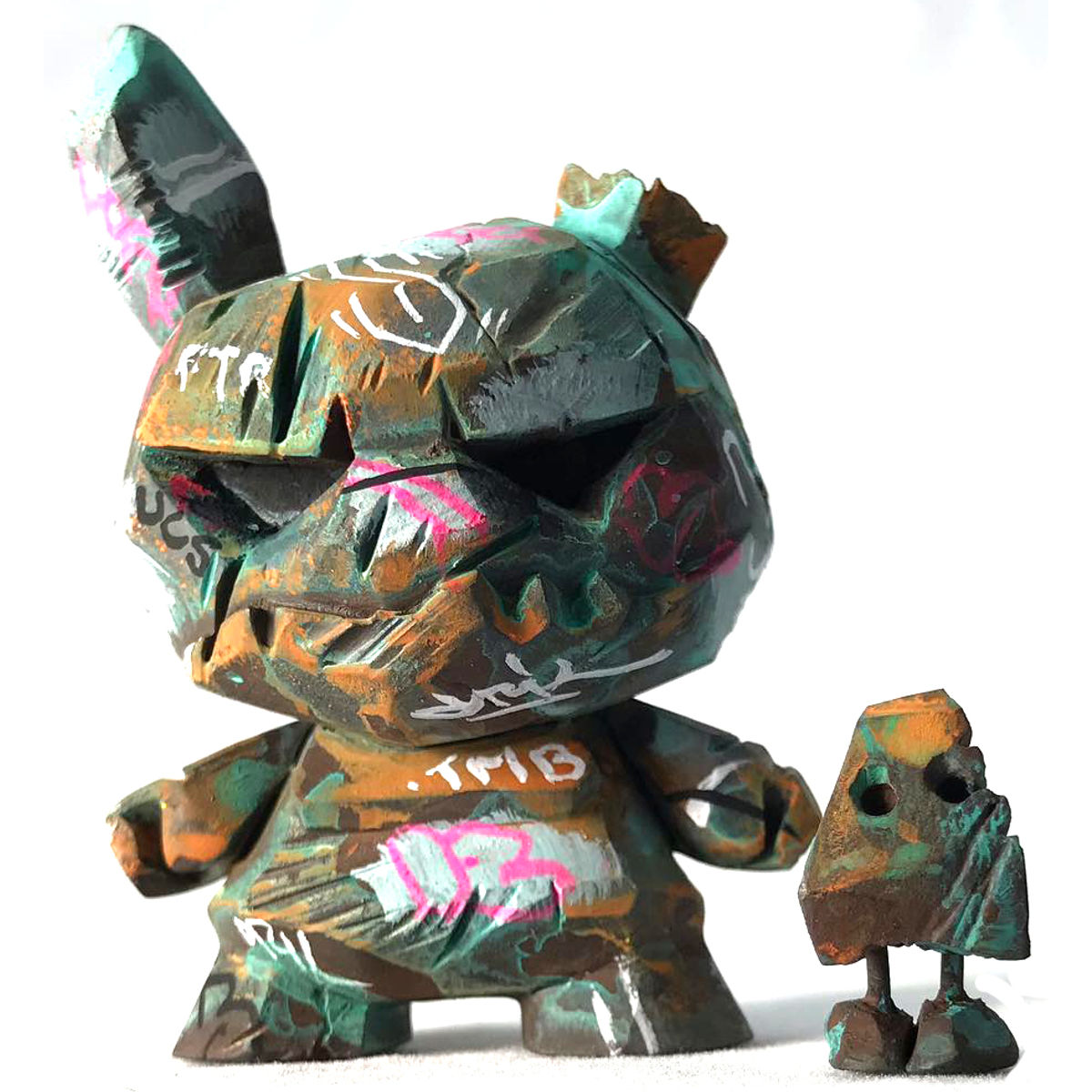 DrilOne is a New Yorker at heart and a San Franciscan by location. On the East Coast, he painted only 2d work; on the west coast, toys and other 3D objects are his preferred canvas. He began working with vinyl in 2005, and soon after stumbled upon the formula that would serve as his signature style. By taking a playful object and distressing it to, quite literally, its breaking point, Dril comments on oblivion, transience, and re-birth. Dril says simply: “I love rust, decay, history, ruins, military, skulls, vintage, and all this makes me who I am.” Art is in Dril’s blood. The son of a painter, he cannot imagine or remember life without drawing. He is a veteran of the New York City public school system and spent most of his life amidst the city’s chaos and creativity. His upbringing and admiration for contemporary, pop and graffiti artists are reflected in his work. The many inspirations that inform his art include abandoned amusement parks, insane asylums and old military bunkers. Dril has made a name for himself with his instantly recognizable visual expression, and his sought-after figures can be seen in art galleries and collections around the world. Standouts among