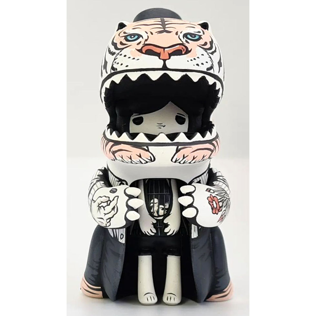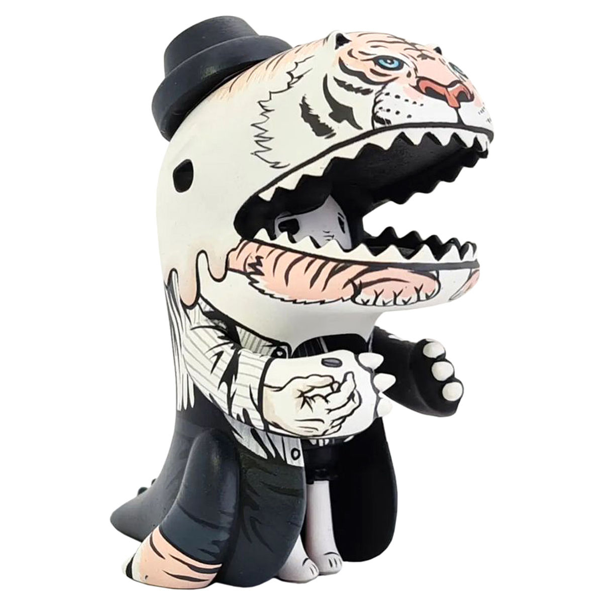 A whimsical and stylized toy figure. The figure appears to be a hybrid of a dinosaur and a human, with a dinosaur-like head and body but human-like limbs and attire. The dinosaur head has a prominent snout with sharp teeth and a fierce expression. The figure is dressed in a formal outfit, including a top hat, a shirt with a bow-tie, and a vest. The figure's hands are positioned in a gesture, with one hand raised and the other hand pointing forward. The overall design is playful and artistic, blending elements of fantasy and humor.Born into the greyness of England at the end of the Seventies, by the age of four Jon-Paul Kaiser knew that what he wanted to do in life was a draw. From that point he rarely strayed from that path; scribbling and doodling his way through School, College and University. After working with Porlzilla, Jon-Paul decided to go it alone concentrating at first on the toy customization scene, building up a name and strong reputation for himself with his stark Black & White custom style, influenced by comic book art, film noir & Ukiyo-e prints. This lead to him being approached by established toy producers for designs for their platform toys. Principally amongst these are Toy2R who have released numerous JPK Platforms.