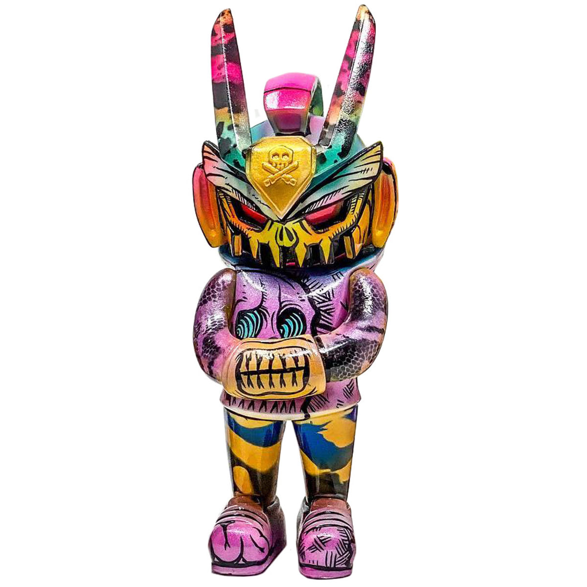 TEQ63 is a designer art toy created by QUICCS, a Filipino artist known for his fusion of streetwear, cyberpunk, and mecha aesthetics. The character is heavily influenced by Japanese mecha (especially Gundam), hip-hop culture, and urban graffiti, making it one of the most recognizable figures in the modern art toy scene. TEQ63 is typically depicted wearing a hoodie, a futuristic skull-like helmet with a visor, and sneakers, often resembling classic streetwear styles. The toy exudes a futuristic, dystopian vibe, with robotic or mechanical details that give it a tech-infused personality. Many releases include different colorways, special editions, and collaborations with brands like Adidas, Kidrobot, Martian Toys, and Devil Toys. TEQ63 figures are primarily produced by Martian Toys and come in multiple sizes and materials, including vinyl, resin, and sofubi (Japanese soft vinyl). Variants range from standard 6-inch figures to oversized, limited-edition versions, as well as exclusive artist collaborations featuring unique designs and colors