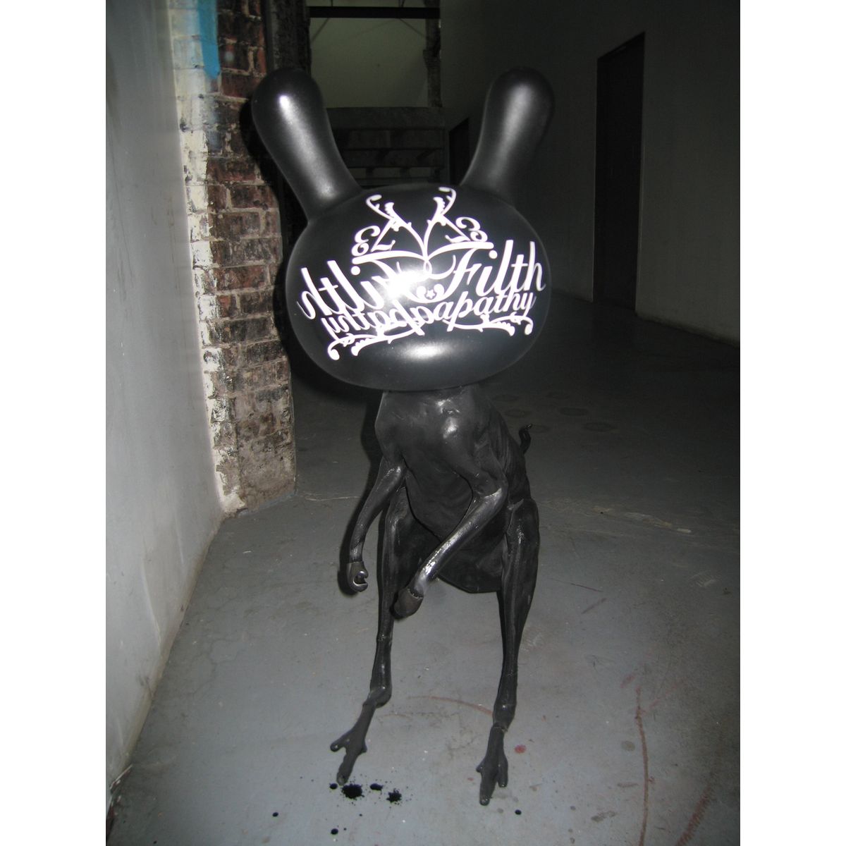 Filth is the nom de guerre of designer and artist Lucas Irwin. Best known for his work in the sub-culture of designer vinyl toys, Irwin has brought his unique design sensibility to toy creations by Kid Robot, Toy2R, Thunderdog Studios, and Toy Qube. He is also is also an accomplished print designer, artist and father. Heavily influenced by the urban landscape, architecture, heavy machinery, instruction manuals, schematics, graffiti, art, and pop culture, Irwin builds complex images by simultaneously weaving together and ripping apart these references and influences. Irwin’s work has been exhibited across the United States, the United Kingdom and Japan. He currently works as a freelance designer in his new hometown of Portland, Oregon. The toy is based on a rabbit figure with distinctive tubular ears. The origin of the name Dunny came from a combination of street slang and one of the early "Devil Bunny" prototypes. The Dunny is sold in four sizes - 3", 5", 8" and 20". The toy has three points of articulation; a 360 degree rotational head and two arms. An artist card or sticker is also included with the 3" Dunny from a series. Most 3" Dunnys and some 8" Dunnys are normally sold as "blind assortment"; the figure is packaged inside a sealed foil wrapper, such that the buyer is not able to see which figure and accessories they are buying. Sealing the figure prevents people from opening and peeking in the boxes and buying only the figures they want. Most Dunnys are packaged inside a clear plastic bag in addition to the foil wrapper. In the second-hand market, this assures the buyer that the article was never on display and is in a "new" condition. With the success of vinyl toys as a medium for expression, many fans and artists have put their own design onto blank Dunnys.
