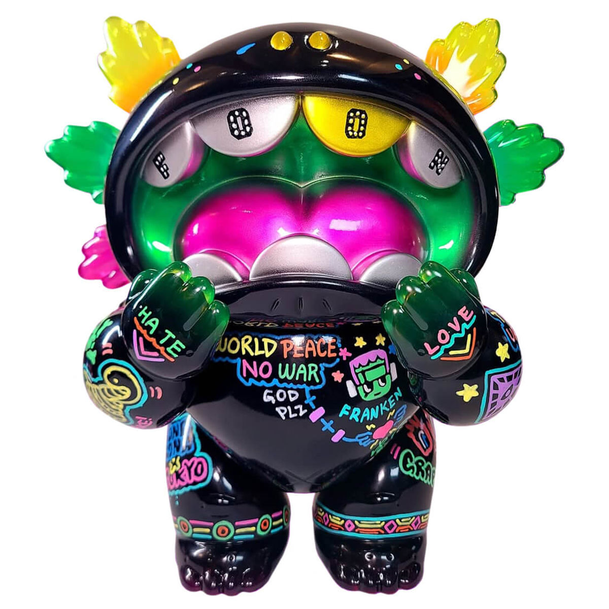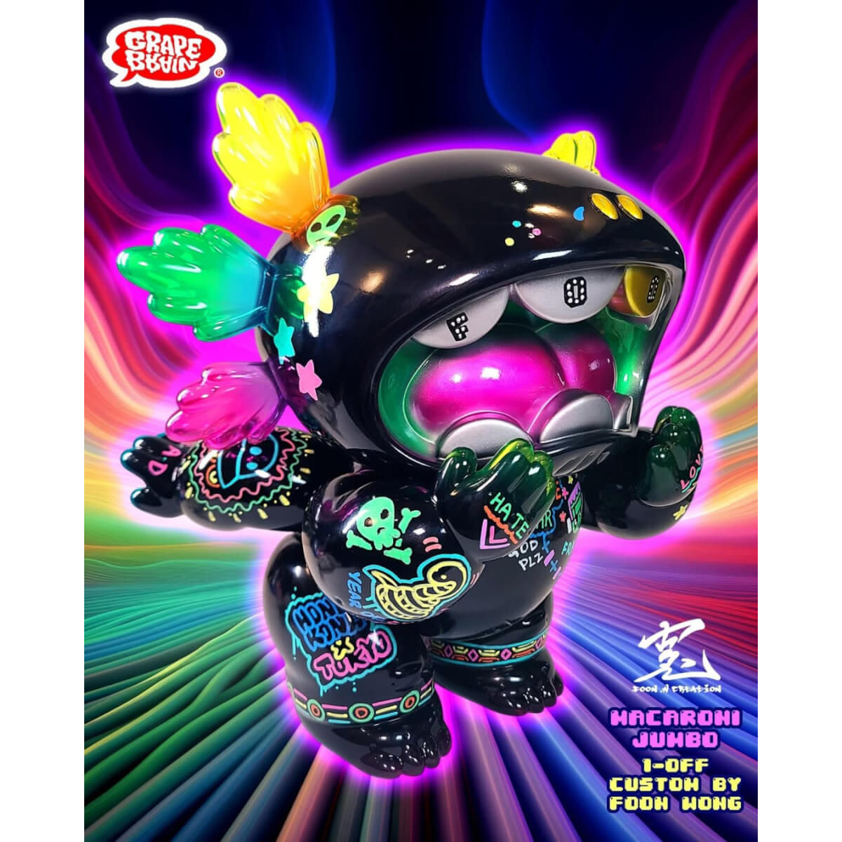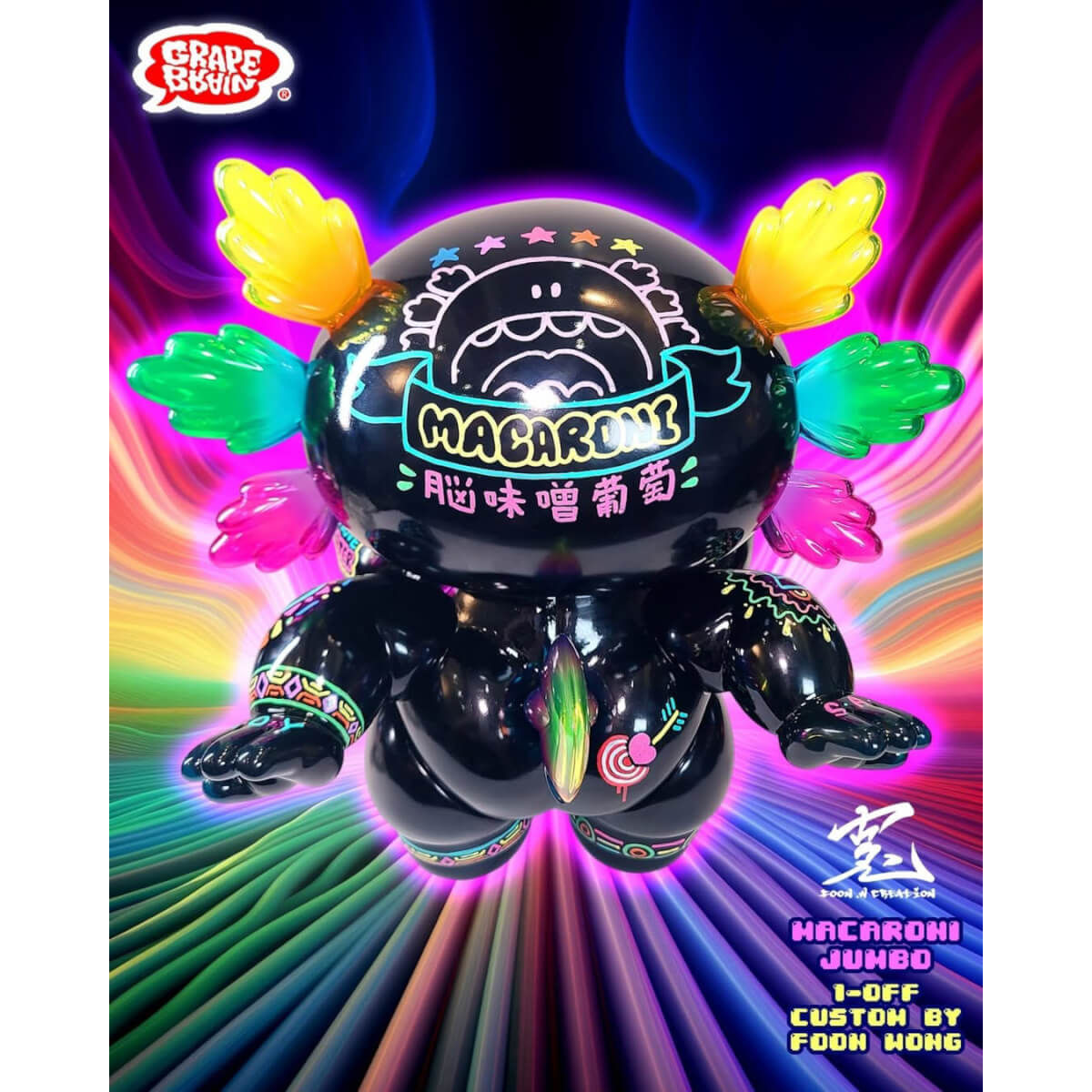 Macaroni is a standout piece in the designer toy scene, blending cute and surreal aesthetics with a playful twist. Inspired by the axolotl, Macaroni features a whimsical design characterized by a large, expressive head, wide eyes, and stubby limbs, all rendered in soft vinyl (sofubi) material.