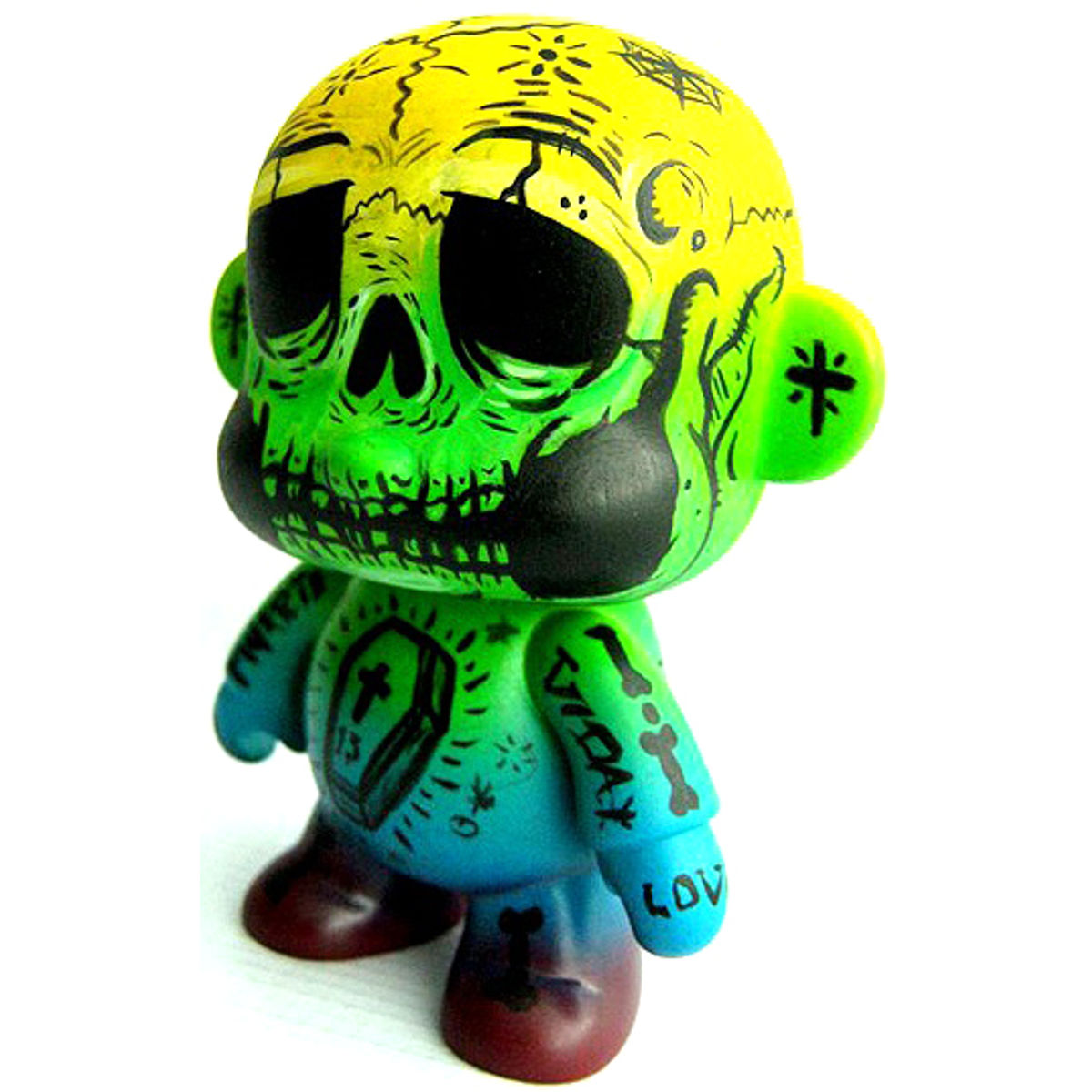 Frank Mysterio is a Mexican artist and designer known for his bold, psychedelic, and graffiti-inspired art toys. His work blends elements of Mexican folklore, lucha libre, lowbrow art, and street culture, resulting in eye-catching, highly detailed designs that often feature skulls, masks, and intricate patterns. Mysterio is particularly recognized for his use of bright neon colors, airbrushed gradients, and tattoo-like linework, giving his figures a unique and unmistakable aesthetic. He frequently customizes sofubi (soft vinyl) toys, adding his signature artistic flair to established platforms while also creating original designs. His work has gained international recognition in the designer toy scene, leading to collaborations with various toy companies and artists. Mysterio’s fusion of Mexican traditions with contemporary urban art makes him a standout figure in the global art toy movement.