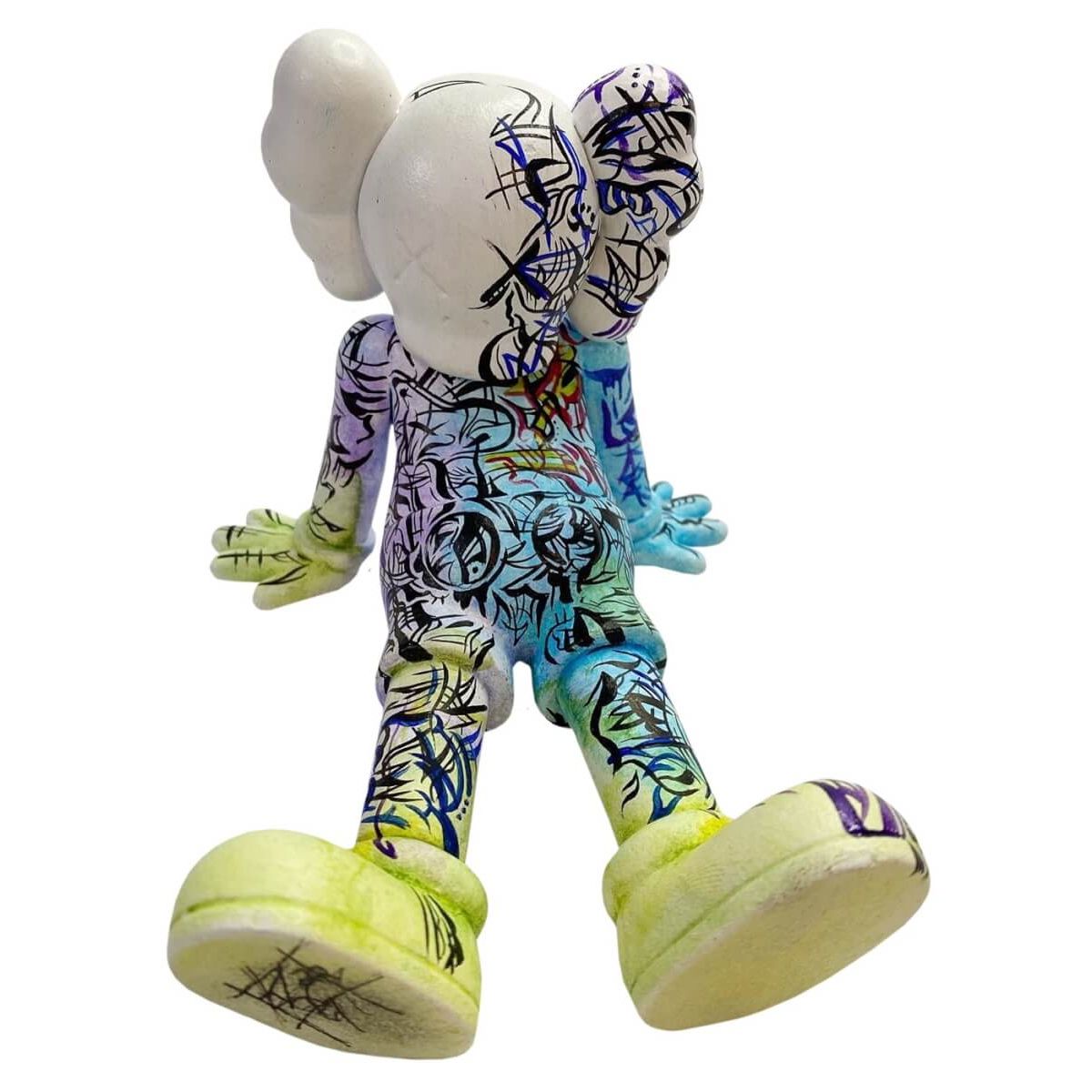 KAWS’ Companion is one of the most iconic figures created by the artist Brian Donnelly, known as KAWS. The Companion character features a cartoon-like figure with a skull-shaped head, crossed-out eyes, and gloved hands, resembling classic animation characters but with a distinct melancholic and introspective expression. Since its debut in the late 1990s, Companion has been released in various forms, including vinyl toys, large-scale sculptures, and limited-edition collaborations. The character is often depicted in different poses, such as covering its face in distress, reclining, floating, or standing tall, reflecting themes of isolation, vulnerability, and contemplation.