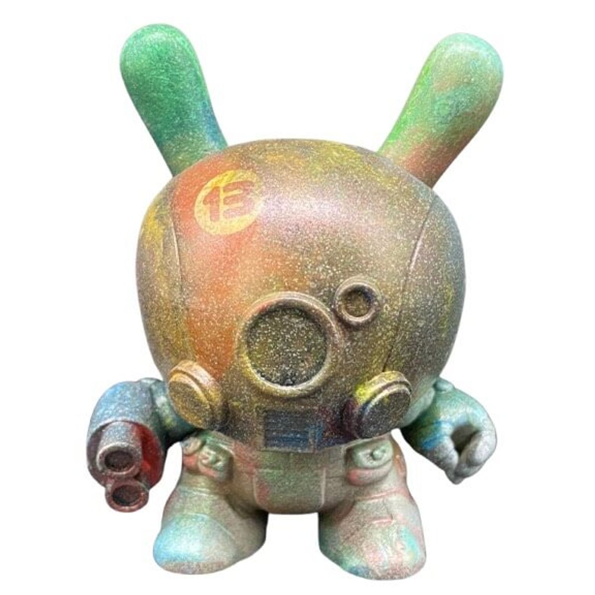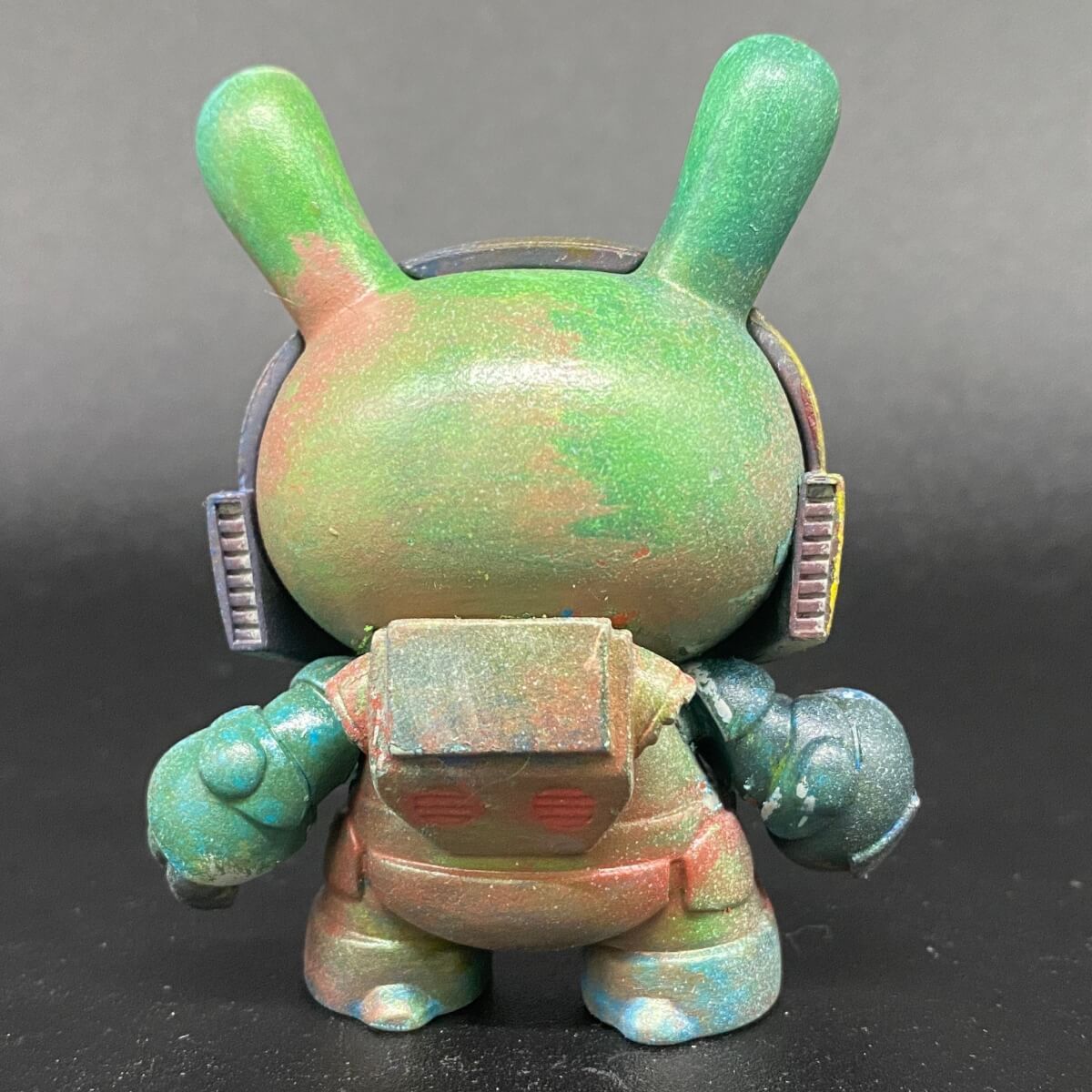 The toy is based on a rabbit figure with distinctive tubular ears. The origin of the name Dunny came from a combination of street slang and one of the early "Devil Bunny" prototypes. The Dunny is sold in four sizes - 3", 5", 8" and 20". The toy has three points of articulation; a 360 degree rotational head and two arms. An artist card or sticker is also included with the 3" Dunny from a series. Most 3" Dunnys and some 8" Dunnys are normally sold as "blind assortment"; the figure is packaged inside a sealed foil wrapper, such that the buyer is not able to see which figure and accessories they are buying. Sealing the figure prevents people from opening and peeking in the boxes and buying only the figures they want. Most Dunnys are packaged inside a clear plastic bag in addition to the foil wrapper. In the second-hand market, this assures the buyer that the article was never on display and is in a "new" condition. With the success of vinyl toys as a medium for expression, many fans and artists have put their own design onto blank Dunnys.