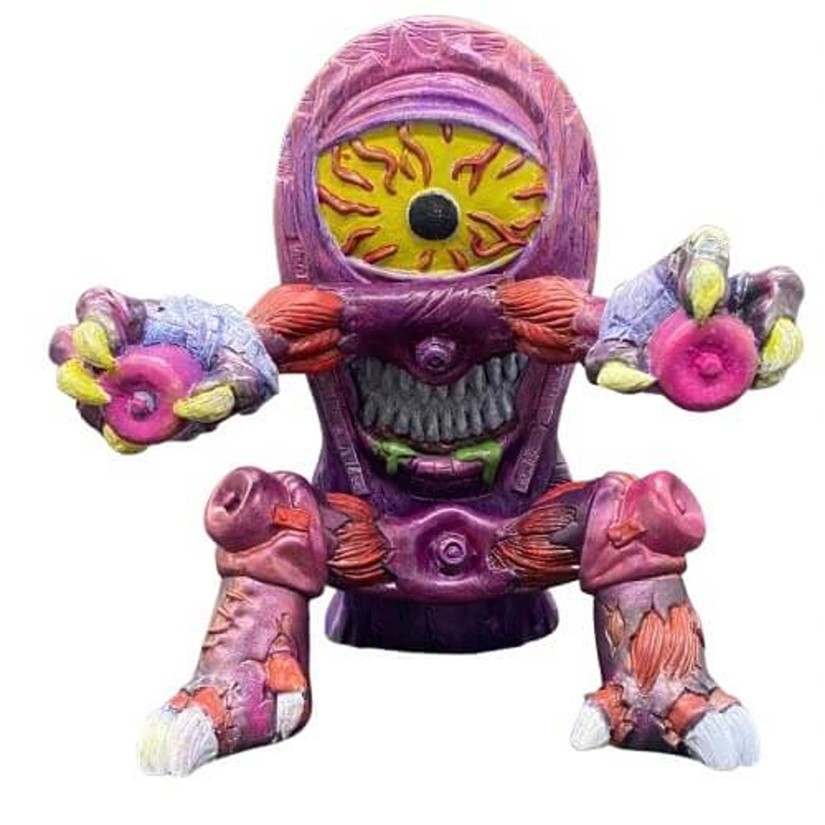 One-off custom on the Kaiju Kruzer by S.W.A.R.M.M. This item is vinyl sofubi with six points of articulation. Comes in bag with header card and stickers.