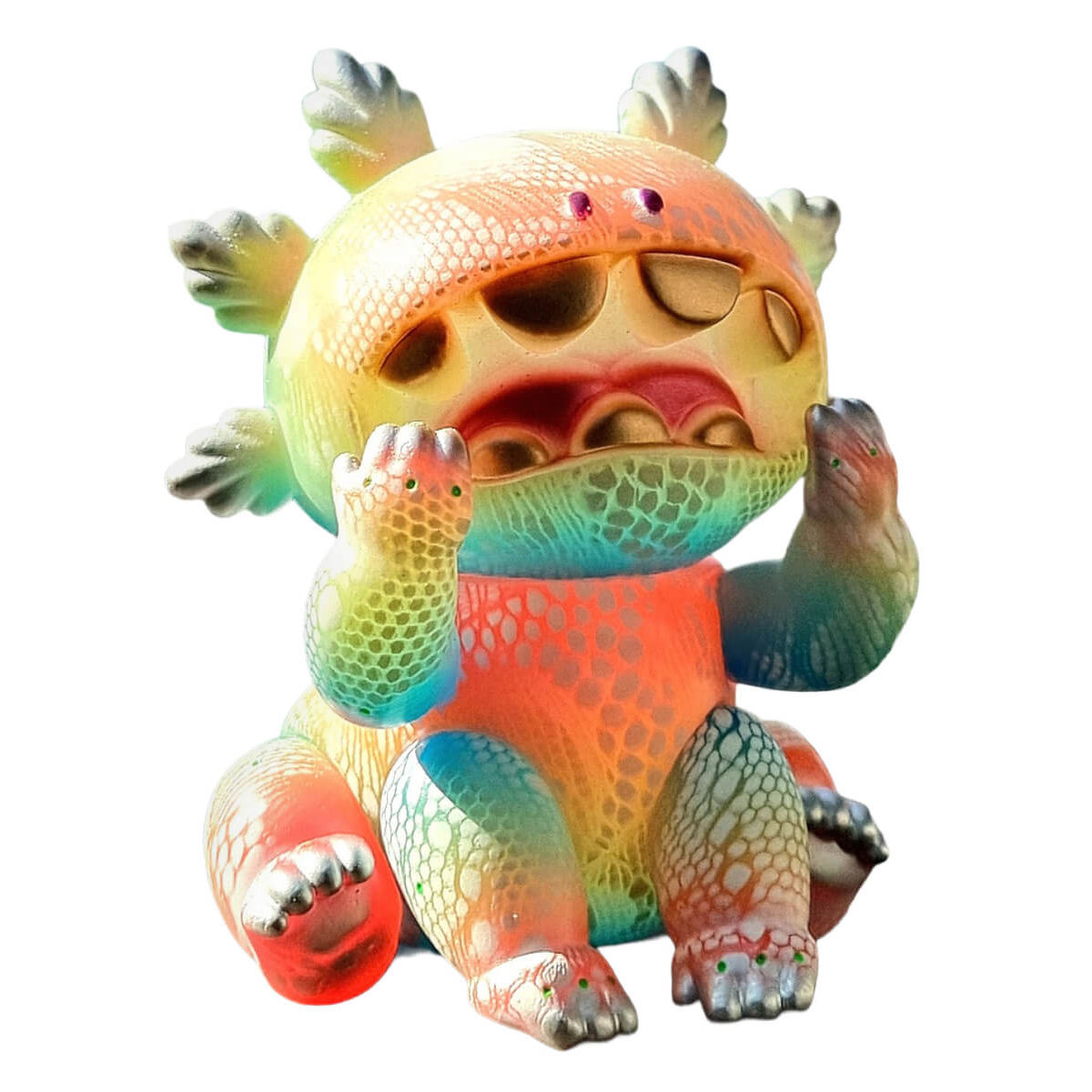 Macaroni is a standout piece in the designer toy scene, blending cute and surreal aesthetics with a playful twist. Inspired by the axolotl, Macaroni features a whimsical design characterized by a large, expressive head, wide eyes, and stubby limbs, all rendered in soft vinyl (sofubi) material. Self-produced art toys are designer collectibles created and manufactured independently by the artist or small teams without the backing of a large toy company or mass-market brand. These toys are often highly personal, artistic expressions and are usually made in limited runs. Key Characteristics include independent creation where the artist is in control of the entire process from concept, sculpting, and painting to production and packaging. These are usually made in small batches, often 10–100 pieces, which adds to their rarity, made using materials like resin, sofubi (Japanese soft vinyl), or 3D-printed components. Grape Brain is a Japanese artist and designer known for a distinctive, colorful, and surreal art style that blends elements of pop art, street culture, and retro aesthetics. The artist’s work often features exaggerated characters with bold outlines, vibrant color palettes, and a playful yet slightly eerie quality. Grape Brain has collaborated with various brands, toy designers, and apparel companies, creating unique figures, apparel designs, and illustrations that stand out for their eye-catching, almost psychedelic appeal.