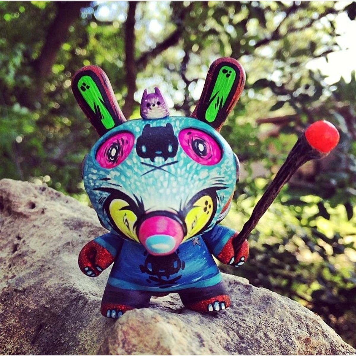 The toy is based on a rabbit figure with distinctive tubular ears. The origin of the name Dunny came from a combination of street slang and one of the early "Devil Bunny" prototypes. The Dunny is sold in four sizes - 3", 5", 8" and 20". The toy has three points of articulation; a 360 degree rotational head and two arms. An artist card or sticker is also included with the 3" Dunny from a series. Most 3" Dunnys and some 8" Dunnys are normally sold as "blind assortment"; the figure is packaged inside a sealed foil wrapper, such that the buyer is not able to see which figure and accessories they are buying. Sealing the figure prevents people from opening and peeking in the boxes and buying only the figures they want. Most Dunnys are packaged inside a clear plastic bag in addition to the foil wrapper. In the second-hand market, this assures the buyer that the article was never on display and is in a "new" condition. With the success of vinyl toys as a medium for expression, many fans and artists have put their own design onto blank Dunnys. This is my world! Colour and fluorescence! Writer, designer, customizer!