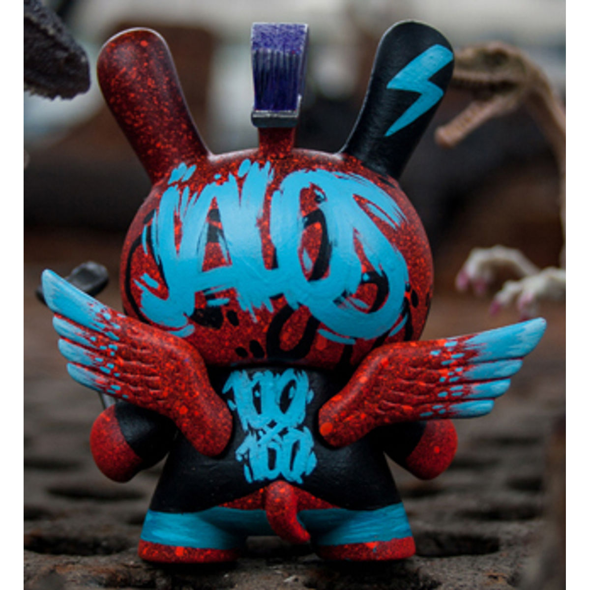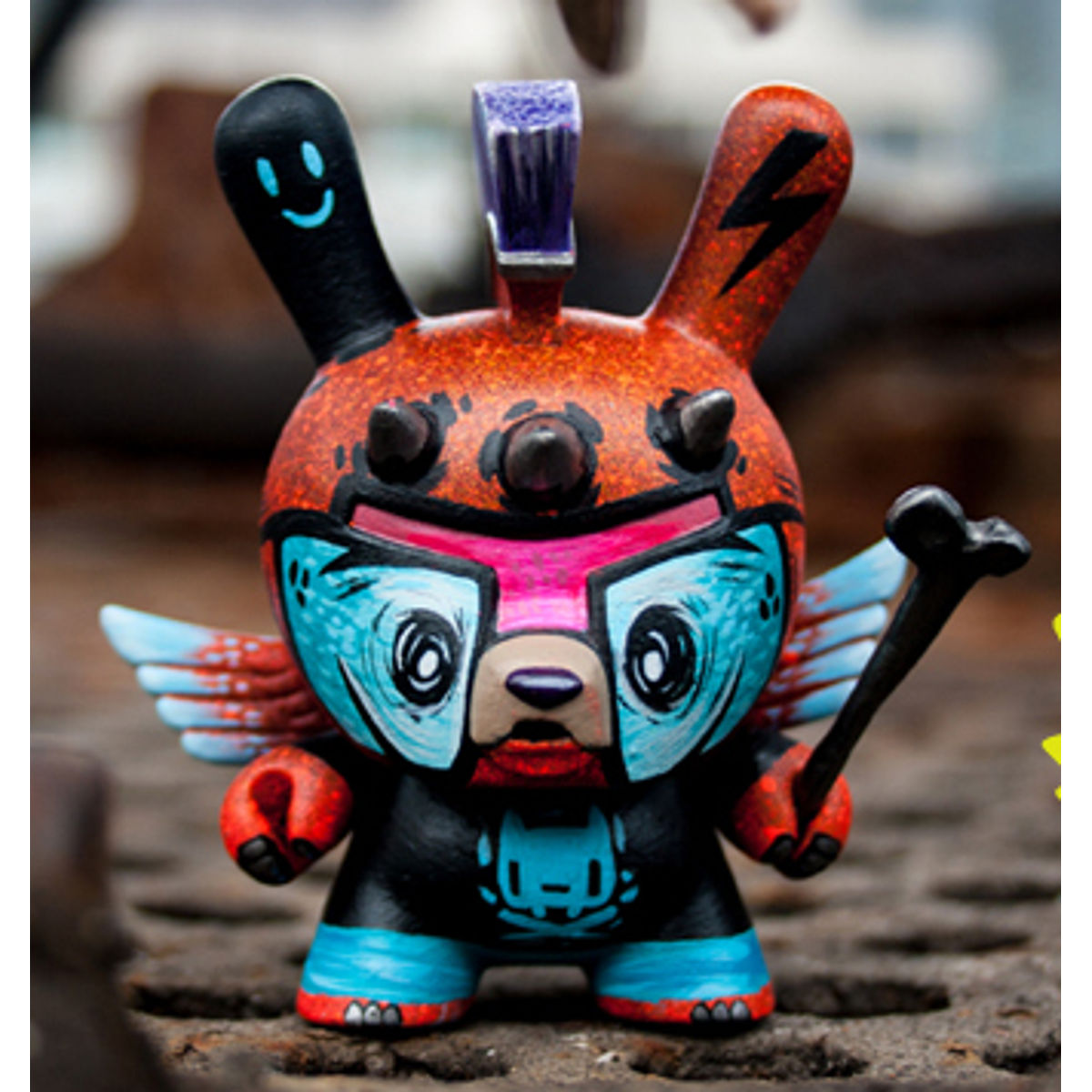 The toy is based on a rabbit figure with distinctive tubular ears. The origin of the name Dunny came from a combination of street slang and one of the early "Devil Bunny" prototypes. The Dunny is sold in four sizes - 3", 5", 8" and 20". The toy has three points of articulation; a 360 degree rotational head and two arms. An artist card or sticker is also included with the 3" Dunny from a series. Most 3" Dunnys and some 8" Dunnys are normally sold as "blind assortment"; the figure is packaged inside a sealed foil wrapper, such that the buyer is not able to see which figure and accessories they are buying. Sealing the figure prevents people from opening and peeking in the boxes and buying only the figures they want. Most Dunnys are packaged inside a clear plastic bag in addition to the foil wrapper. In the second-hand market, this assures the buyer that the article was never on display and is in a "new" condition. With the success of vinyl toys as a medium for expression, many fans and artists have put their own design onto blank Dunnys. This is my world! Colour and fluorescence! Writer, designer, customizer!