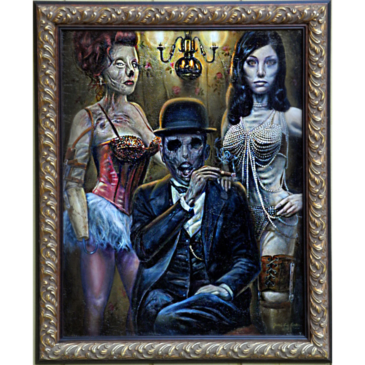 Established in 2008, Last Rites has become a premiere gallery for the Dark Art movement and a haven for artists who prefer to explore the ominous, uncomfortable, and eccentric in their work. Striving to showcase some of the most thought-provoking art in contemporary surrealism, Last Rites creates an atmosphere where the artist can harness limitless expression and the observer can reflect inward, inspired to understand that which resides in us all. The uniqueness of Last Rites, aside from its focus on such work, is the collaborative effort between founding director, Genevive Zacconi and Paul Booth. The fact that they are both accomplished artists as well, allows for a stronger relationship with the exhibited artists, and a more understanding and creative approach to the overall presentation of their work- enhancing the experience for everyone who visits Last Rites Gallery. Last Rites Gallery is located at 511 W 33rd Street, between 10th and 11th Avenues (3 blocks from Penn Station), 3rd floor, New York, NY 10011. Gallery hours are Tuesday through Saturday, 2pm to 9pm, Sundays 2pm to 6pm. Oil paint is a type of slow-drying paint that consists of particles of pigment suspended in a drying oil, commonly linseed oil. The viscosity of the paint may be modified by the addition of a solvent such as turpentine or white spirit, and varnish may be added to increase the glossiness of the dried film. Oil paints have been used in Europe since the 12th century for simple decoration, but were not widely adopted as an artistic medium until the early 15th century. Common modern applications of oil paint are in finishing and protection of wood in buildings and exposed metal structures such as ships and bridges. Its hard-wearing properties and luminous colors make it desirable for both interior and exterior use on wood and metal. Due to its slow-drying properties, it has recently been used in paint-on-glass animation. Thickness of coat has considerable bearing on time required for drying: thin coats of oil paint dry relatively quickly.