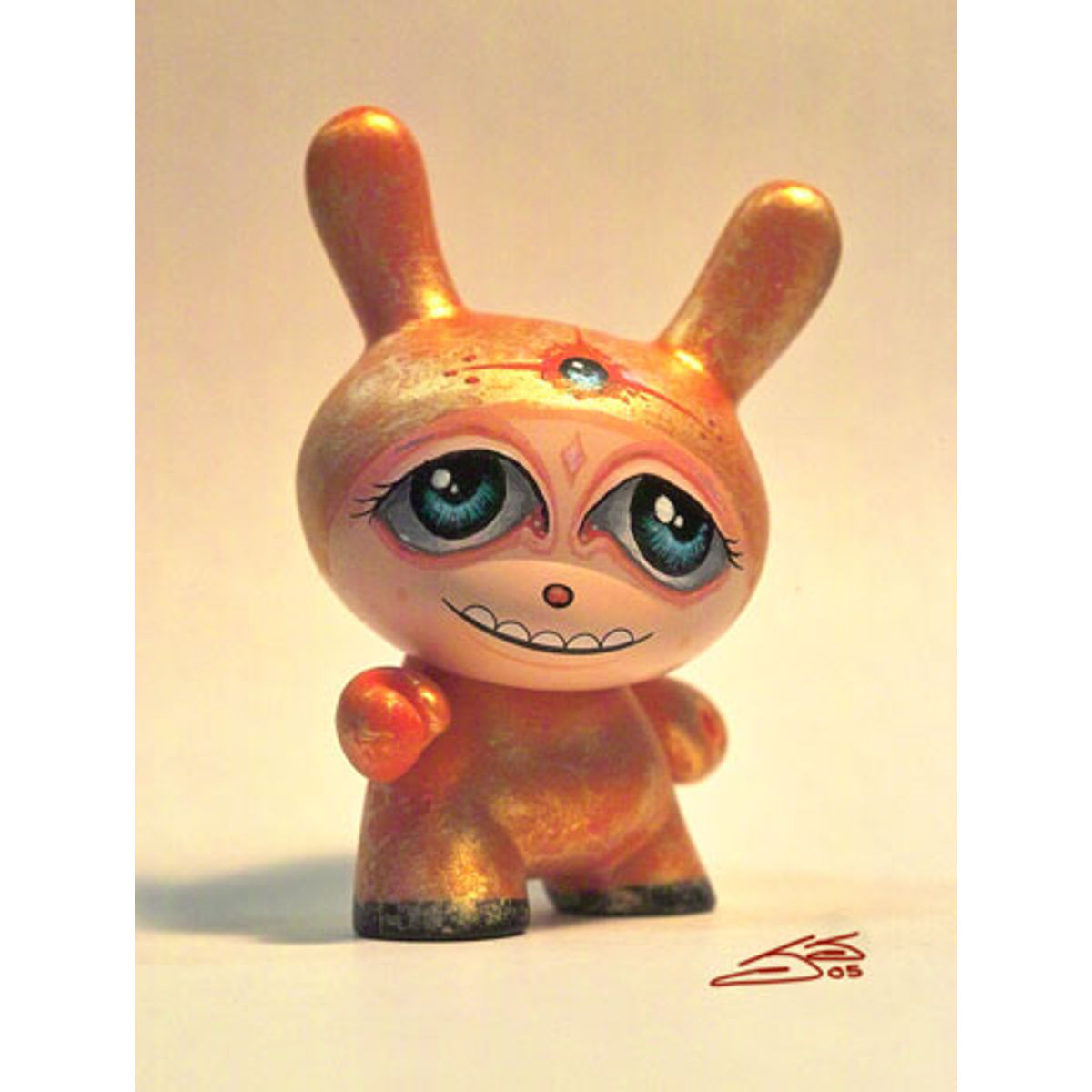 The toy is based on a rabbit figure with distinctive tubular ears. The origin of the name Dunny came from a combination of street slang and one of the early "Devil Bunny" prototypes. The Dunny is sold in four sizes - 3", 5", 8" and 20". The toy has three points of articulation; a 360 degree rotational head and two arms. An artist card or sticker is also included with the 3" Dunny from a series. Most 3" Dunnys and some 8" Dunnys are normally sold as "blind assortment"; the figure is packaged inside a sealed foil wrapper, such that the buyer is not able to see which figure and accessories they are buying. Sealing the figure prevents people from opening and peeking in the boxes and buying only the figures they want. Most Dunnys are packaged inside a clear plastic bag in addition to the foil wrapper. In the second-hand market, this assures the buyer that the article was never on display and is in a "new" condition. With the success of vinyl toys as a medium for expression, many fans and artists have put their own design onto blank Dunnys.
