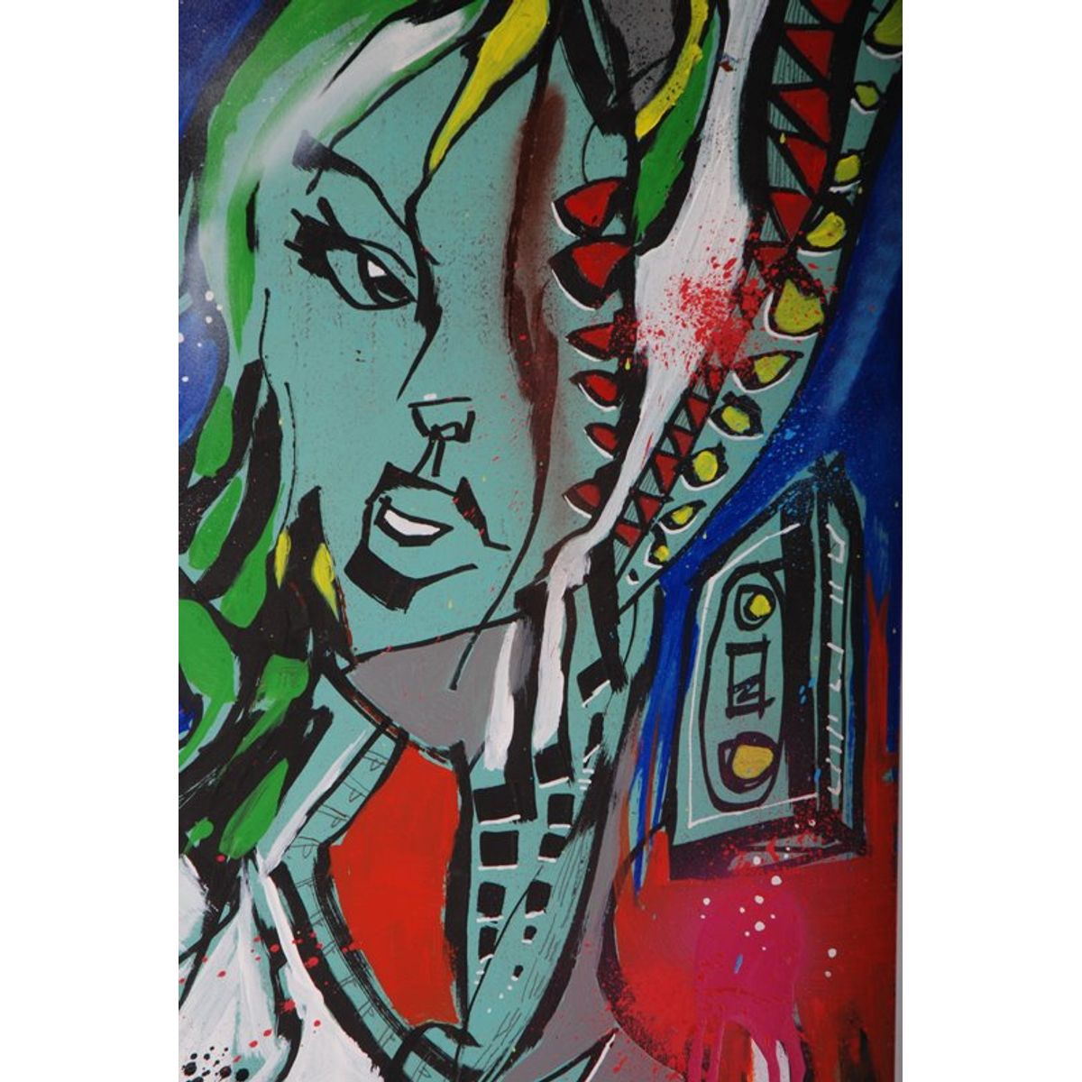 Jim Mahfood aka Food One is a freelance artist working professionally in the fields of illustration, advertising, comic books, murals, fine art, animation, live art in nightclubs, and custom body-painting. He has worked for every major comic book company and his illustrations have appeared in such publications as Playboy, Spin, Spectrum Illustration Annual, Star Wars Gamer, URB, the Hollywood Reporter, BPM, the Phoenix New Times, Mad Magazine, Heavy Metal, and more. Highlights of his career include illustrating director Kevin Smith's "Clerks" comics, handling the art chores on the entire ad campaign for Colt 45 malt liquor in 2007-08, painting the murals on Comedy Central's "Sarah Silverman Show", illustrating the "Kickpuncher" comic book that was included in the Season 1 DVD of NBC's hit show, "Community", illustrating and art directing reggae legend Ziggy Marley's Mixed media tends to refer to a work of visual art that combines various traditionally distinct visual art media. For example, a work on canvas that combines paint, ink, and collage could properly be called a "mixed media" work. When creating a painted or photographed work using mixed media it is important to choose the layers carefully and allow enough drying time between the layers to ensure the final work will have integrity. If many different media are used it is equally important to choose a sturdy foundation upon which the different layers are imposed. Many interesting effects can be achieved by using mixed media. Often, found objects are used in conjunction with traditional artist media, such as paints and graphite, to express a meaning in the everyday life. In this manner, many different elements of art become more flexible than with traditional artist media.