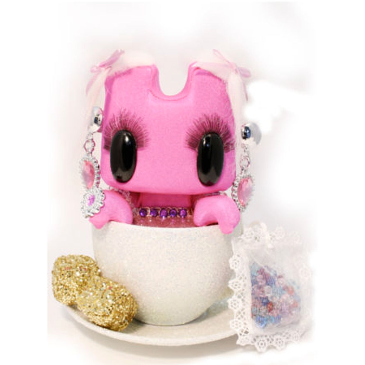 Lunartik in a Cup of Tea is a designer toy series created by British artist Matt JOnes (aka Lunartik). These collectible vinyl figures feature a stylized character sitting inside a teacup, blending a whimsical and minimalist design with a playful tea-themed concept. The original Lunartik in a Cup of Tea figure is a small, round-headed character with a simple face, often depicted with a tea bag tag hanging from the cup. The series includes Mini-Teas (smaller versions with various colors and flavors) and special edition teas, featuring collaborations, custom designs, and exclusive releases. The custom tea tour was a touring show with exhibitions at Forbidden Planet London, Outland Gallery Amsterdam, sixxa store Vienna, Fat Buddah Glasgow, Richard Goodall Gallery Manchester, Iksentrik Bath and the final exhibition/auction at Kidrobot London!