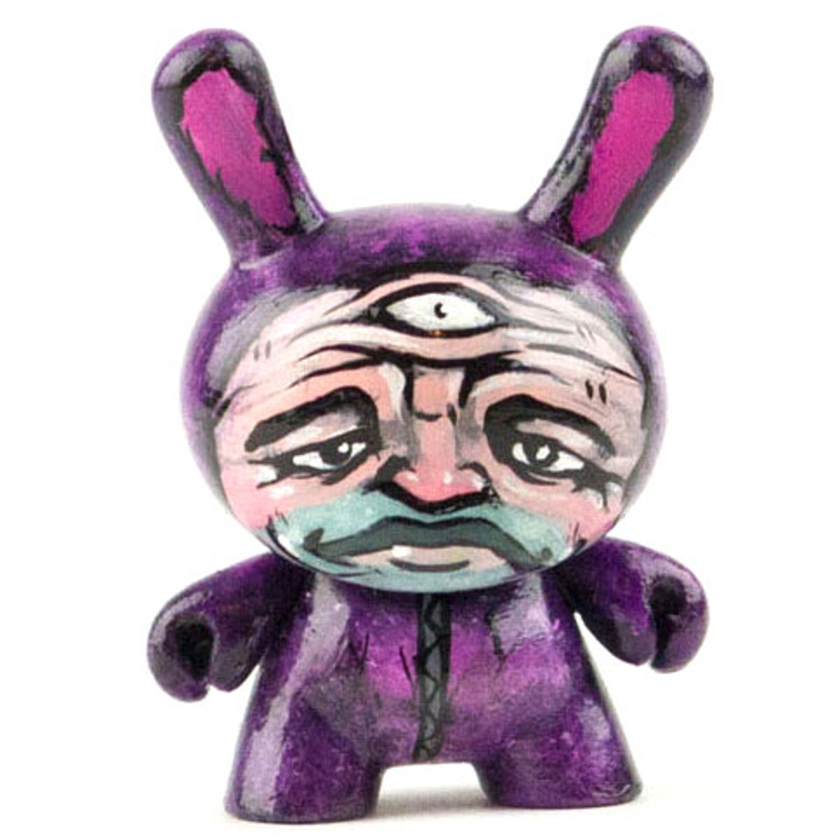 The toy is based on a rabbit figure with distinctive tubular ears. The origin of the name Dunny came from a combination of street slang and one of the early "Devil Bunny" prototypes. The Dunny is sold in four sizes - 3", 5", 8" and 20". The toy has three points of articulation; a 360 degree rotational head and two arms. An artist card or sticker is also included with the 3" Dunny from a series. Most 3" Dunnys and some 8" Dunnys are normally sold as "blind assortment"; the figure is packaged inside a sealed foil wrapper, such that the buyer is not able to see which figure and accessories they are buying. Sealing the figure prevents people from opening and peeking in the boxes and buying only the figures they want. Most Dunnys are packaged inside a clear plastic bag in addition to the foil wrapper. In the second-hand market, this assures the buyer that the article was never on display and is in a "new" condition. With the success of vinyl toys as a medium for expression, many fans and artists have put their own design onto blank Dunnys.