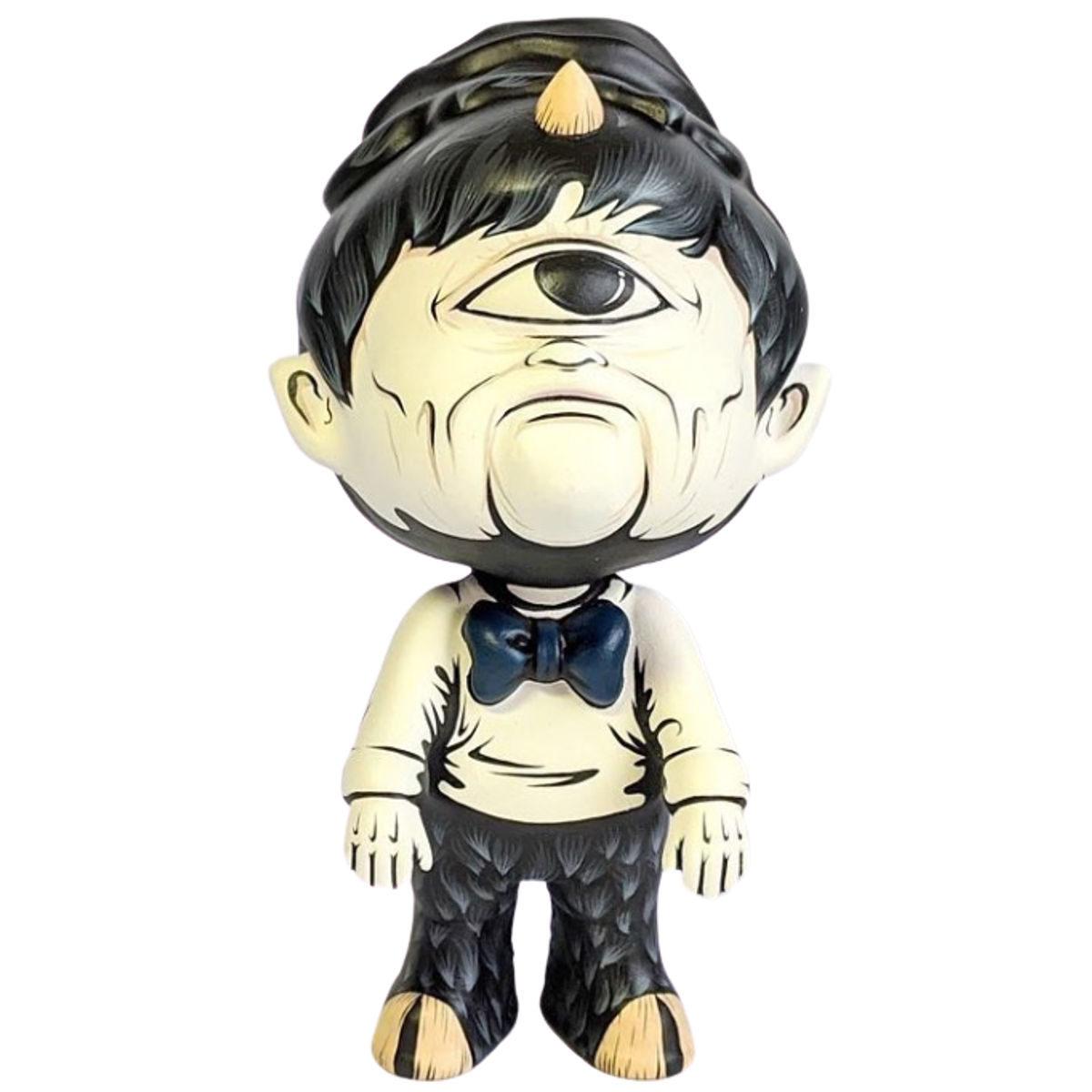 A figurine of a character with a distinct appearance. The character has a large, round head with a prominent eye and a small, pointed horn on top of its head. It is dressed in a white shirt with a blue bow tie and has black, textured pants. The figurine stands on two legs and has a somewhat whimsical or cartoonish design.Born into the greyness of England at the end of the Seventies, by the age of four Jon-Paul Kaiser knew that what he wanted to do in life was a draw. From that point he rarely strayed from that path; scribbling and doodling his way through School, College and University. After working with Porlzilla, Jon-Paul decided to go it alone concentrating at first on the toy customization scene, building up a name and strong reputation for himself with his stark Black & White custom style, influenced by comic book art, film noir & Ukiyo-e prints. This lead to him being approached by established toy producers for designs for their platform toys. Principally amongst these are Toy2R who have released numerous JPK Platforms.
