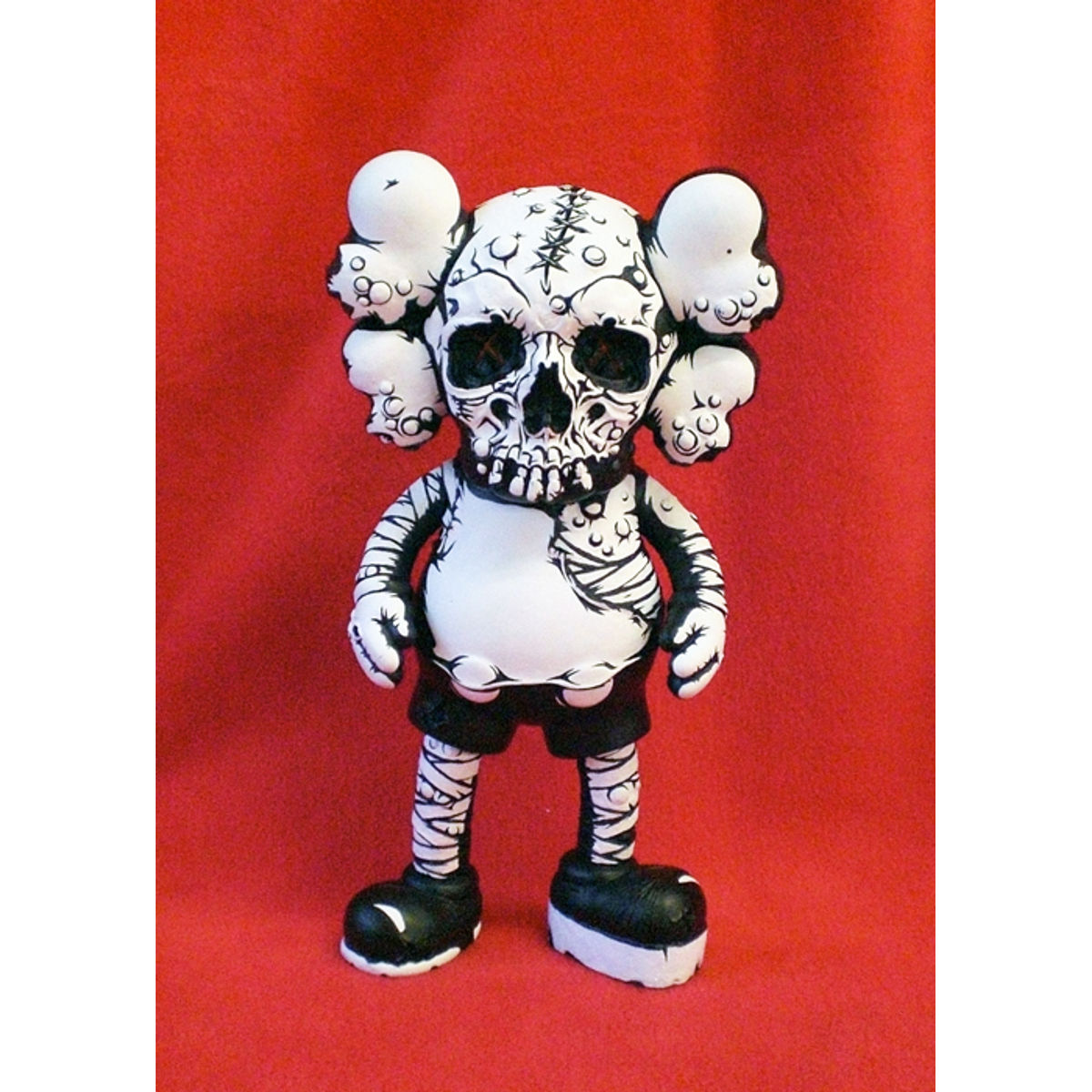 A toy or figurine that resembles a character with a skull-like face. The character has large, round eyes and is adorned with multiple smaller skulls on its head. It is wearing a white outfit with black patterns and has black shoes. The toy stands upright against a red background.Born into the greyness of England at the end of the Seventies, by the age of four Jon-Paul Kaiser knew that what he wanted to do in life was a draw. From that point he rarely strayed from that path; scribbling and doodling his way through School, College and University. After working with Porlzilla, Jon-Paul decided to go it alone concentrating at first on the toy customization scene, building up a name and strong reputation for himself with his stark Black & White custom style, influenced by comic book art, film noir & Ukiyo-e prints. This lead to him being approached by established toy producers for designs for their platform toys. Principally amongst these are Toy2R who have released numerous JPK Platforms.