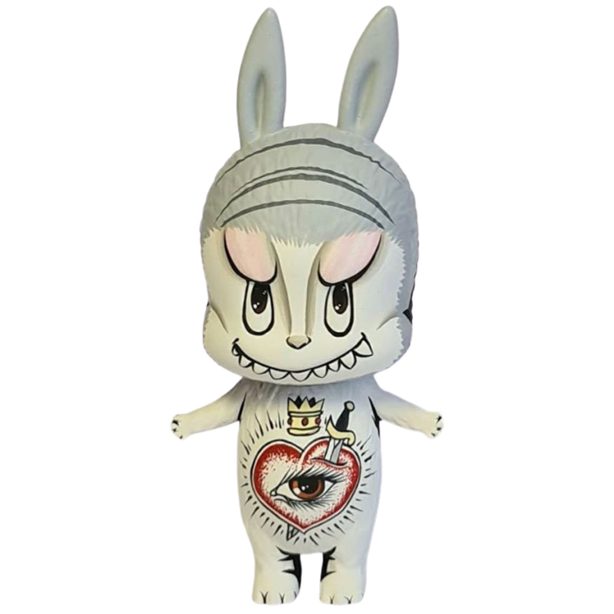 A whimsical, cartoonish character that resembles a rabbit. The rabbit has large, round eyes with pink inner eyelids, and it appears to have a somewhat mischievous or playful expression. It is wearing a headband, and its ears are upright. The rabbit has a tattoo-like design on its chest, which includes a heart with an eye inside it and a crown on top. The character has a somewhat exaggerated, cartoonish body with elongated limbs and distinct, pointed fingers.Born into the greyness of England at the end of the Seventies, by the age of four Jon-Paul Kaiser knew that what he wanted to do in life was a draw. From that point he rarely strayed from that path; scribbling and doodling his way through School, College and University. After working with Porlzilla, Jon-Paul decided to go it alone concentrating at first on the toy customization scene, building up a name and strong reputation for himself with his stark Black & White custom style, influenced by comic book art, film noir & Ukiyo-e prints. This lead to him being approached by established toy producers for designs for their platform toys. Principally amongst these are Toy2R who have released numerous JPK Platforms. Hong Kong-based artist Kasing Lung creator of Zimomo, Labubu and Tycoco characters and others.