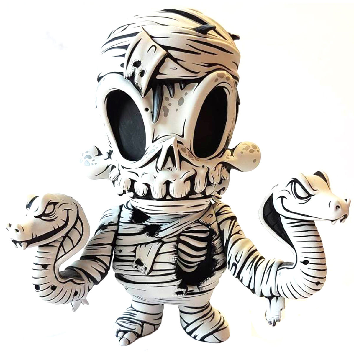 A whimsical and eerie character that appears to be a mummy. The character has large, round eyes with a menacing expression, and its body is wrapped in traditional mummy bandages. The mummy has elongated limbs, with its arms and legs ending in what appear to be skeletal or bone-like structures. The character is standing upright with its arms outstretched, giving it a somewhat menacing pose. The overall color scheme is predominantly black and white, enhancing the eerie aesthetic.Born into the greyness of England at the end of the Seventies, by the age of four Jon-Paul Kaiser knew that what he wanted to do in life was a draw. From that point he rarely strayed from that path; scribbling and doodling his way through School, College and University. After working with Porlzilla, Jon-Paul decided to go it alone concentrating at first on the toy customization scene, building up a name and strong reputation for himself with his stark Black & White custom style, influenced by comic book art, film noir & Ukiyo-e prints. This lead to him being approached by established toy producers for designs for their platform toys. Principally amongst these are Toy2R who have released numerous JPK Platforms.
