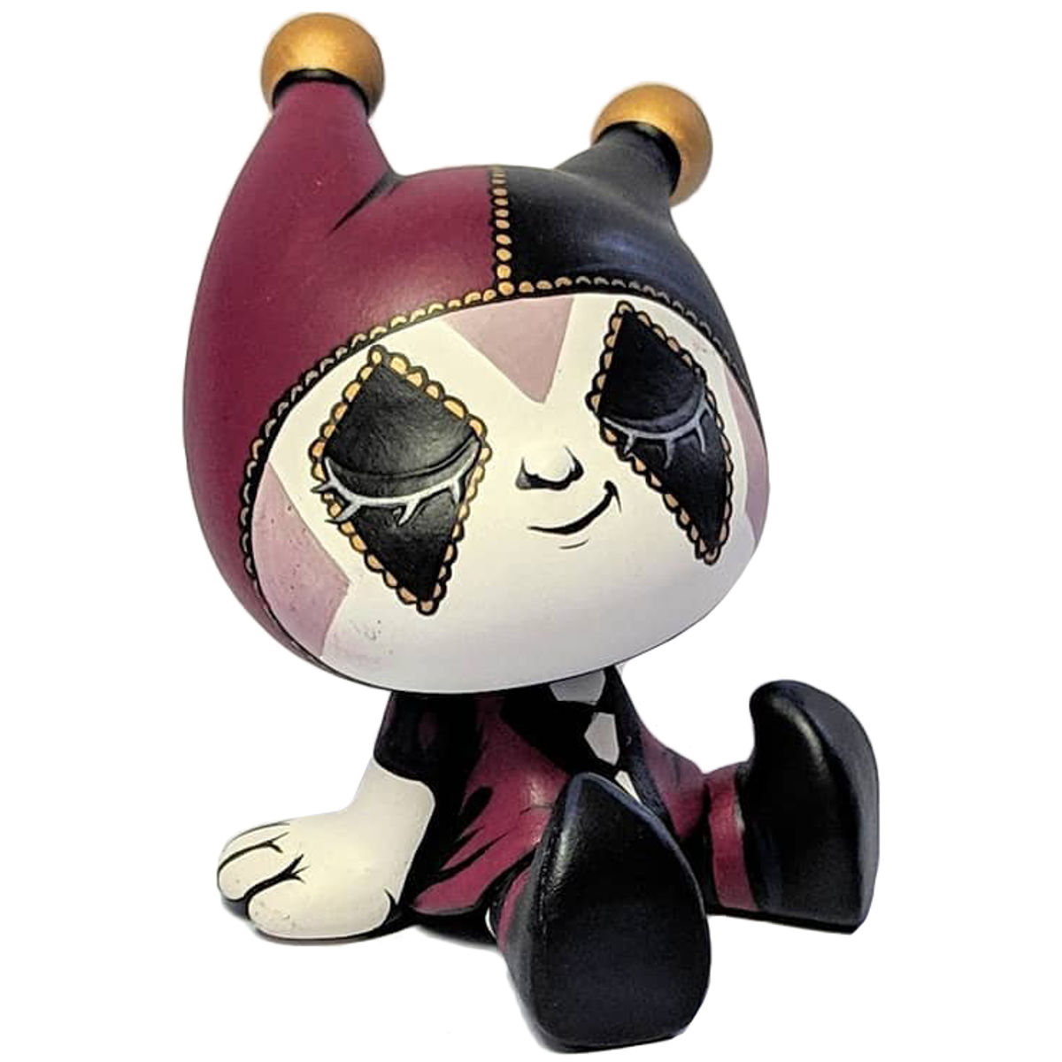 A whimsical, cartoonish character that appears to be a bear. The bear has a distinct design with a jester or harlequin-like hat, which is predominantly purple with gold detailing. The bear's face is painted with a white base, accented with black and gold details to resemble a jester's mask. The bear is sitting down with its legs spread out and its arms resting on its knees. The overall design is playful and colorful.Born into the greyness of England at the end of the Seventies, by the age of four Jon-Paul Kaiser knew that what he wanted to do in life was a draw. From that point he rarely strayed from that path; scribbling and doodling his way through School, College and University. After working with Porlzilla, Jon-Paul decided to go it alone concentrating at first on the toy customization scene, building up a name and strong reputation for himself with his stark Black & White custom style, influenced by comic book art, film noir & Ukiyo-e prints. This lead to him being approached by established toy producers for designs for their platform toys. Principally amongst these are Toy2R who have released numerous JPK Platforms.
