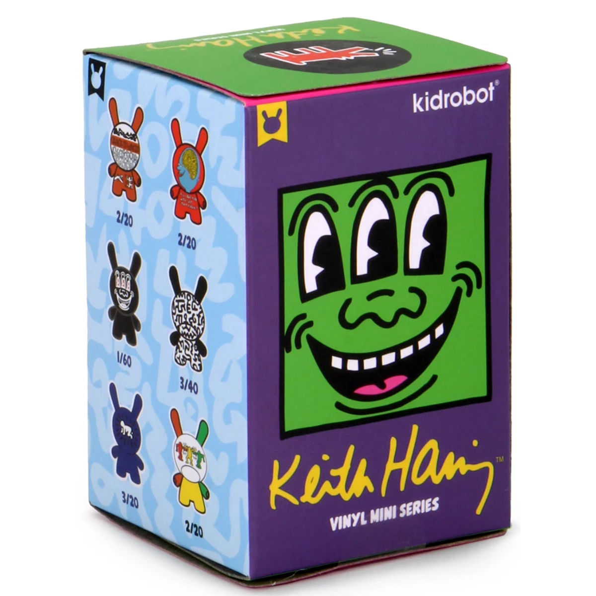 Founded in 2002 by designer Paul Budnitz, Kidrobot is the world's premier creator of limited edition art toys and apparel. Kidrobot creates toys, apparel, accessories, and other products in collaboration with many of the world's most talented artists and designers. The products sold at Kidrobot are the centerpieces of a global movement that exemplifies the cutting edge of both pop art and mass culture. Many Kidrobot toys, such as Dunny, MUNNY, and Frank Kozik's Labbits and Mongers, attract huge followings. Artists that work with Kidrobot have gained celebrity status-these include USA artists Frank Kozik, Tim Biskup, Huck Gee, Joe Ledbetter, Tristan Eaton, Paul Budnitz, and Tara McPherson; the German design collective eBoy; Japan's Devilrobots & Mad Barbarians; French street artists Tilt & Mist; the UK's TADO and ilovedust; Australia's Nathan Jurevicius; Argentina's DOMA; and many, many others. Kidrobot also regularly collaborates with many of the world's top brands to create unique limited editions products. Past collaborations include Marc Jacobs, Visionaire Magazine, Barneys New York, The Standard Hotels, Playboy, Burton, Nike, Lacoste, Nooka, Matt Groening & more. A blend of sculpture and popular art, many of Kidrobot's exclusive toys are extremely rare and collectible. Artists often create a series of only a few hundred The toy is based on a rabbit figure with distinctive tubular ears. The origin of the name Dunny came from a combination of street slang and one of the early "Devil Bunny" prototypes. The Dunny is sold in four sizes - 3", 5", 8" and 20". The toy has three points of articulation; a 360 degree rotational head and two arms. An artist card or sticker is also included with the 3" Dunny from a series. Most 3" Dunnys and some 8" Dunnys are normally sold as "blind assortment"; the figure is packaged inside a sealed foil wrapper, such that the buyer is not able to see which figure and accessories they are buying. Sealing the figure prevents people from opening and peeking in the boxes and buying only the figures they want. Most Dunnys are packaged inside a clear plastic bag in addition to the foil wrapper. In the second-hand market, this assures the buyer that the article was never on display and is in a "new" condition. With the success of vinyl toys as a medium for expression, many fans and artists have put their own design onto blank Dunnys. Continuing our celebration of inspirational artists of the 20th century, Kidrobot brings art to life with the first collectible 3-inch tall Dunny mini figure series featuring the work of Keith Haring. Each of the 12 Dunny figures in the Kidrobot x Keith Haring Dunny Series features one of Keith Haring’s iconic art pieces from his short but impactful career. Each premium vinyl Dunny art figure is sealed in a foil bag and blind boxed to preserve the rarity and collectability of each figure in the series. Each figure in the series has a different probability of being pulled and are even blind to us.