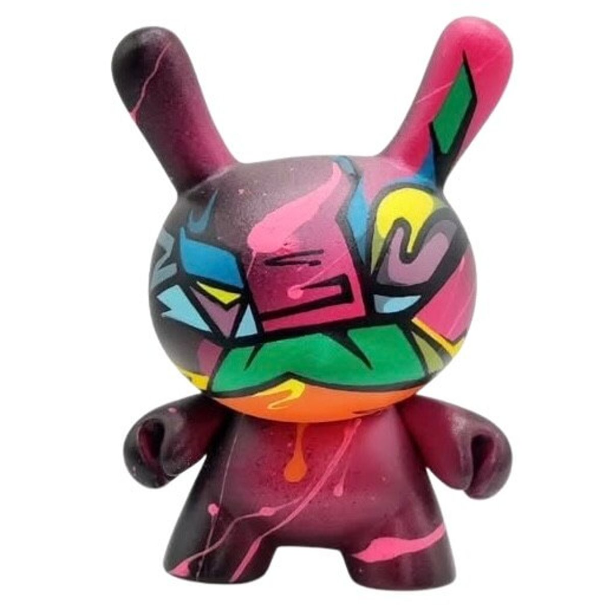 The toy is based on a rabbit figure with distinctive tubular ears. The origin of the name Dunny came from a combination of street slang and one of the early "Devil Bunny" prototypes. The Dunny is sold in four sizes - 3", 5", 8" and 20". The toy has three points of articulation; a 360 degree rotational head and two arms. An artist card or sticker is also included with the 3" Dunny from a series. Most 3" Dunnys and some 8" Dunnys are normally sold as "blind assortment"; the figure is packaged inside a sealed foil wrapper, such that the buyer is not able to see which figure and accessories they are buying. Sealing the figure prevents people from opening and peeking in the boxes and buying only the figures they want. Most Dunnys are packaged inside a clear plastic bag in addition to the foil wrapper. In the second-hand market, this assures the buyer that the article was never on display and is in a "new" condition. With the success of vinyl toys as a medium for expression, many fans and artists have put their own design onto blank Dunnys.