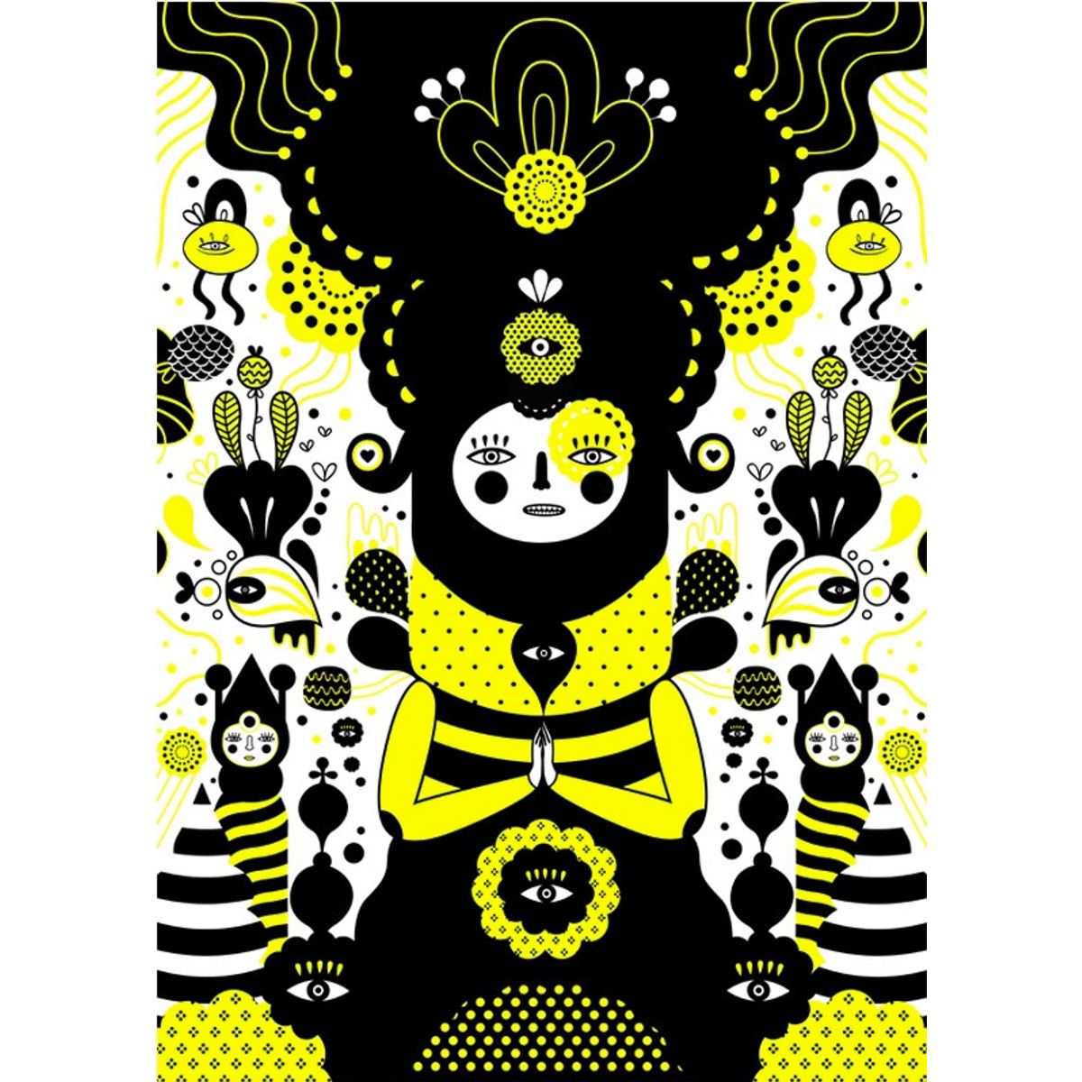 Muxxi is an illustrator and character designer from Guatemala, based in Berlin, Germany. Over the years she has developed a distinctive and unique style, creating colorful and whimsical worlds full of joy and magic. Her work is predominantly digital but she also loves to explore and experiment with different techniques and delve into painting and sculpting in her home studio. Her quirky characters and illustrations have been featured in multiple gallery exhibitions and published in popular design books and magazines such as Creative Review, IdN, and Computer Arts. Screen printing is a printing technique that uses a woven mesh to support an ink-blocking stencil. The attached stencil forms open areas of mesh that transfer ink or other printable materials which can be pressed through the mesh as a sharp-edged image onto a substrate. A roller or squeegee is moved across the screen stencil, forcing or pumping ink past the threads of the woven mesh in the open areas. Screen printing is also a stencil method of print making in which a design is imposed on a screen of silk or other fine mesh, with blank areas coated with an impermeable substance, and ink is forced through the mesh onto the printing surface. It is also known as silkscreen, seriography, and serigraph.
