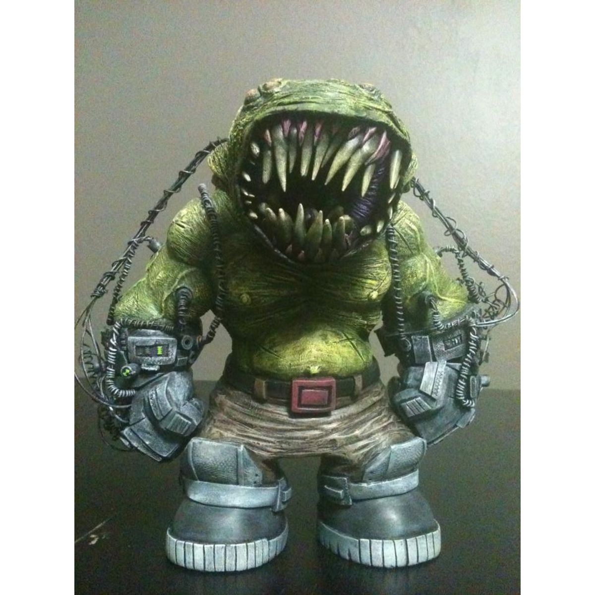 Nerviswr3k is the artistic alias of American artist Gabriel Rivas, a Phoenix-based sculptor and designer renowned for his intricate, biomechanical creations that delve into themes of mental health, dystopia, and inner turmoil. Since entering the designer toy scene in 2006, he has developed a distinct style characterized by monstrous figures adorned with sharp teeth, cybernetic elements, and surreal anatomical features. Rivas’s work is deeply personal, often reflecting his experiences with mental health challenges. His sculptures manifest as paranoid delusions of overlords, infestations, drones, and personifications of pain, among other demons . These themes are brought to life through his use of mixed media, incorporating materials like recycled computer parts, polymer clay, and acrylic paints to create textured, layered pieces .