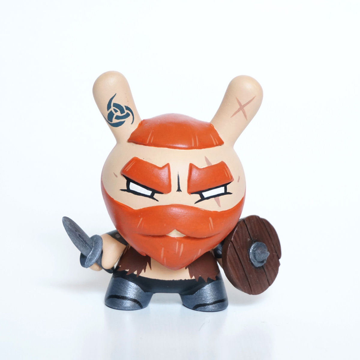 The toy is based on a rabbit figure with distinctive tubular ears. The origin of the name Dunny came from a combination of street slang and one of the early "Devil Bunny" prototypes. The Dunny is sold in four sizes - 3", 5", 8" and 20". The toy has three points of articulation; a 360 degree rotational head and two arms. An artist card or sticker is also included with the 3" Dunny from a series. Most 3" Dunnys and some 8" Dunnys are normally sold as "blind assortment"; the figure is packaged inside a sealed foil wrapper, such that the buyer is not able to see which figure and accessories they are buying. Sealing the figure prevents people from opening and peeking in the boxes and buying only the figures they want. Most Dunnys are packaged inside a clear plastic bag in addition to the foil wrapper. In the second-hand market, this assures the buyer that the article was never on display and is in a "new" condition. With the success of vinyl toys as a medium for expression, many fans and artists have put their own design onto blank Dunnys.