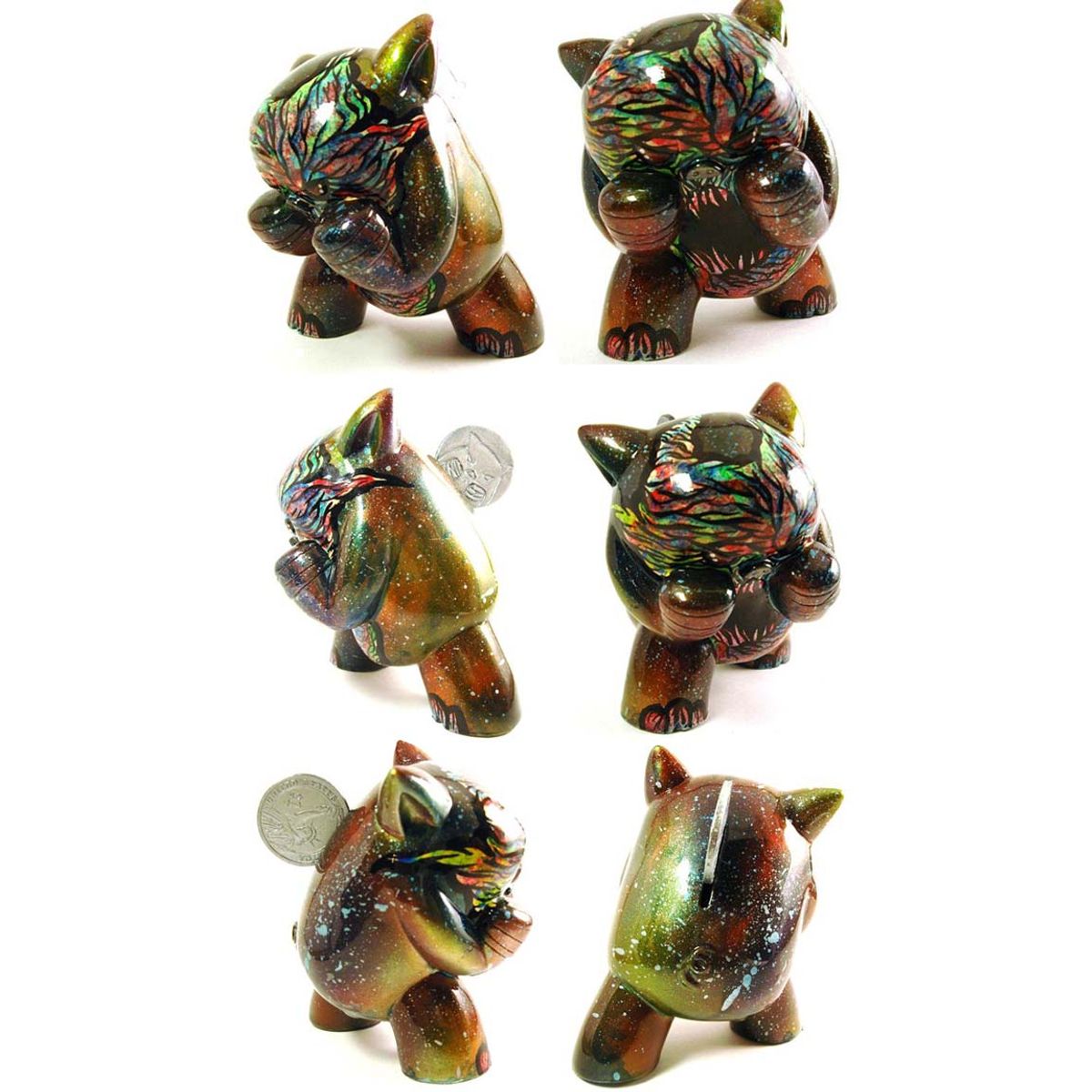 Kalua Moola was created by Lord Mesa and sculpted and produced by Argonaut Resins. There are a total of 30 pieces worldwide, including eleven customized pieces from the Artist Crossover Series. OsirisOrion is a self taught artist born and raised in Queens, NY and is currently residing in Southington, CT. Osiris's painting and sculpting style has been described by many as "Visceral Surrealism". He blends multiple color layers with heavy detailed line work. Osiris's subject matter are monsters and spirits portrayed through human like turmoils and emotions. Osiris is also know for his work customizing vinyl toys which he applies the same philosophies as he does in his paintings. OsirisOrion's influences are a fusion of abstract, surrealism, graffiti and elements of horror and fantasy. Osiris's work has proudly been exhibited across the US and has had the privilege to work with companies/organizations such as Rumble Monsters, October Toys, Argonaut Resins and The Poster Cause Project