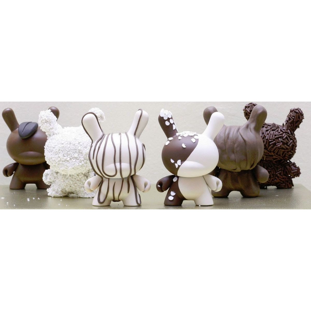The toy is based on a rabbit figure with distinctive tubular ears. The origin of the name Dunny came from a combination of street slang and one of the early "Devil Bunny" prototypes. The Dunny is sold in four sizes - 3", 5", 8" and 20". The toy has three points of articulation; a 360 degree rotational head and two arms. An artist card or sticker is also included with the 3" Dunny from a series. Most 3" Dunnys and some 8" Dunnys are normally sold as "blind assortment"; the figure is packaged inside a sealed foil wrapper, such that the buyer is not able to see which figure and accessories they are buying. Sealing the figure prevents people from opening and peeking in the boxes and buying only the figures they want. Most Dunnys are packaged inside a clear plastic bag in addition to the foil wrapper. In the second-hand market, this assures the buyer that the article was never on display and is in a "new" condition. With the success of vinyl toys as a medium for expression, many fans and artists have put their own design onto blank Dunnys.