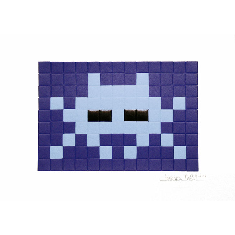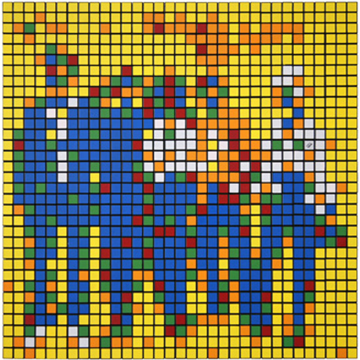 The artist known as Invader was born in 1969 in Paris, France, the city where he is currently based. His work illustrates the overwhelming effect technology has had on contemporary culture while also critiquing it, using the ancient and traditional technique of mosaics to simulate digital pixels. Referencing the 1978 Atari video game, the artist began placing mosaics featuring Space Invaders on the streets of Paris in the late 1990s. Joined by Pac Man ghosts and other popular 8-bit characters, the works soon became a familiar sight to encounter in any urban environment. Invader’s use of tile to create street art, rather than paint or stencil, is not only a unique choice of medium—it also emphasizes his commentary of how digital information networks have affected and transformed our society. Sightings of the work have spread over the last ten years on a global scale as the artist continues invading public spaces across five continents. Currently, Invader’s work can be found on the streets of over forty cities, worldwide. Recently, Invader’s work has evolved, incorporating Rubik’s Cubes in addition to tiles, creating 3D sculptures that echo imagery found in his two-dimensional work. Invader is known to be the originator of this