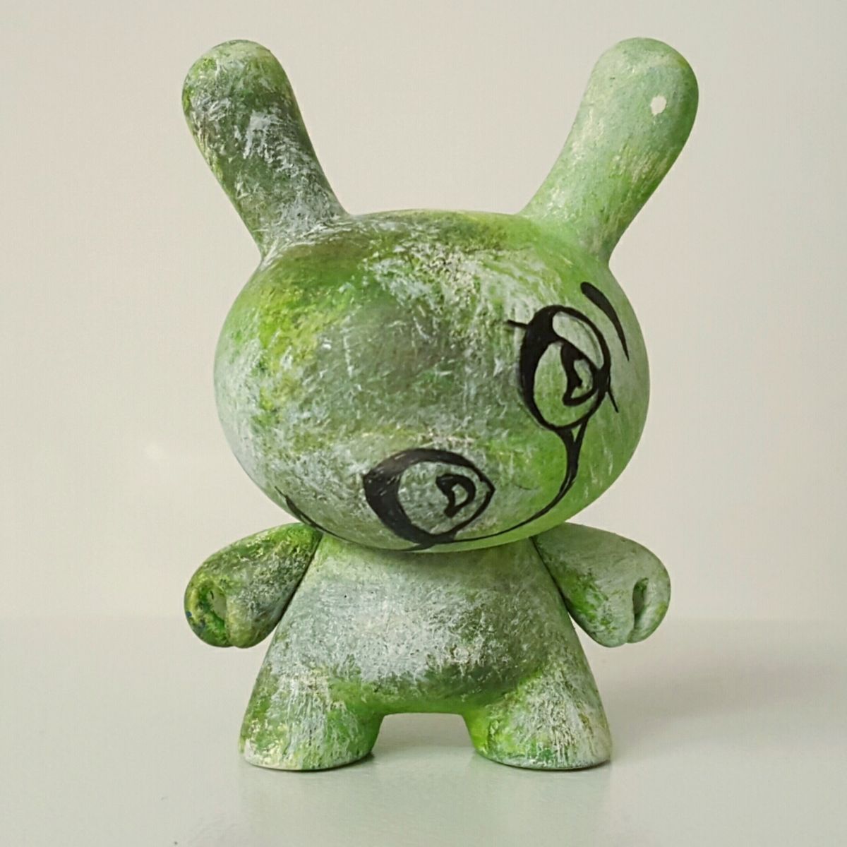 The toy is based on a rabbit figure with distinctive tubular ears. The origin of the name Dunny came from a combination of street slang and one of the early "Devil Bunny" prototypes. The Dunny is sold in four sizes - 3", 5", 8" and 20". The toy has three points of articulation; a 360 degree rotational head and two arms. An artist card or sticker is also included with the 3" Dunny from a series. Most 3" Dunnys and some 8" Dunnys are normally sold as "blind assortment"; the figure is packaged inside a sealed foil wrapper, such that the buyer is not able to see which figure and accessories they are buying. Sealing the figure prevents people from opening and peeking in the boxes and buying only the figures they want. Most Dunnys are packaged inside a clear plastic bag in addition to the foil wrapper. In the second-hand market, this assures the buyer that the article was never on display and is in a "new" condition. With the success of vinyl toys as a medium for expression, many fans and artists have put their own design onto blank Dunnys.
