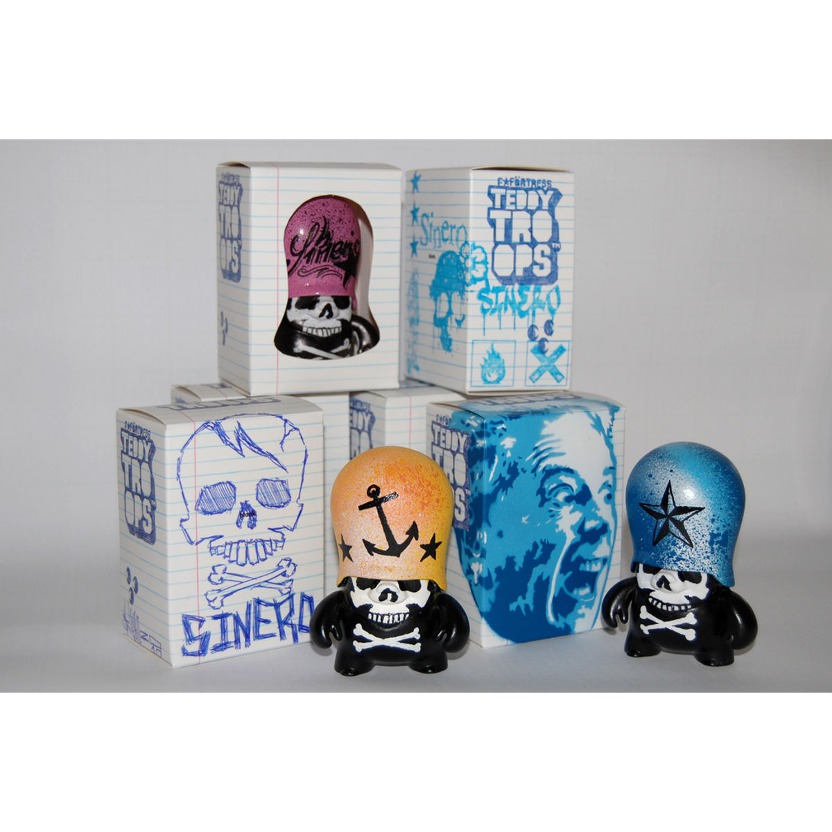 The Teddy Troops had been around in the streets for a while before they also turned into a 3D vinyl toy in 2004. First of all Flying Förtress started in 2002 to get up with his chrome Trooper icon. Trying to use an easier readable illustrative symbol instead of doing the classic coded graffiti letters and tags that he had been doing before since 1989. Together with the chrome pieces there have stickers also been seen around in the streets since 2002. Handpainted or silkscreend ones with a hand-drawn finish on "free" post stickers and series of offset printed stickers.