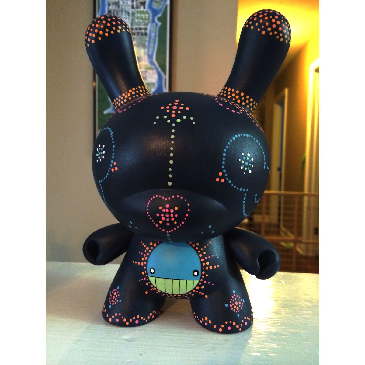 The toy is based on a rabbit figure with distinctive tubular ears. The origin of the name Dunny came from a combination of street slang and one of the early "Devil Bunny" prototypes. The Dunny is sold in four sizes - 3", 5", 8" and 20". The toy has three points of articulation; a 360 degree rotational head and two arms. An artist card or sticker is also included with the 3" Dunny from a series. Most 3" Dunnys and some 8" Dunnys are normally sold as "blind assortment"; the figure is packaged inside a sealed foil wrapper, such that the buyer is not able to see which figure and accessories they are buying. Sealing the figure prevents people from opening and peeking in the boxes and buying only the figures they want. Most Dunnys are packaged inside a clear plastic bag in addition to the foil wrapper. In the second-hand market, this assures the buyer that the article was never on display and is in a "new" condition. With the success of vinyl toys as a medium for expression, many fans and artists have put their own design onto blank Dunnys.